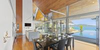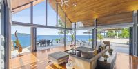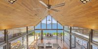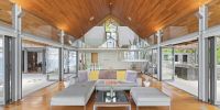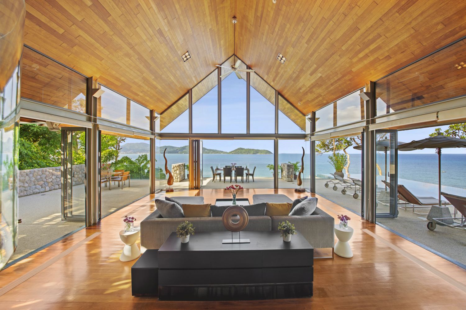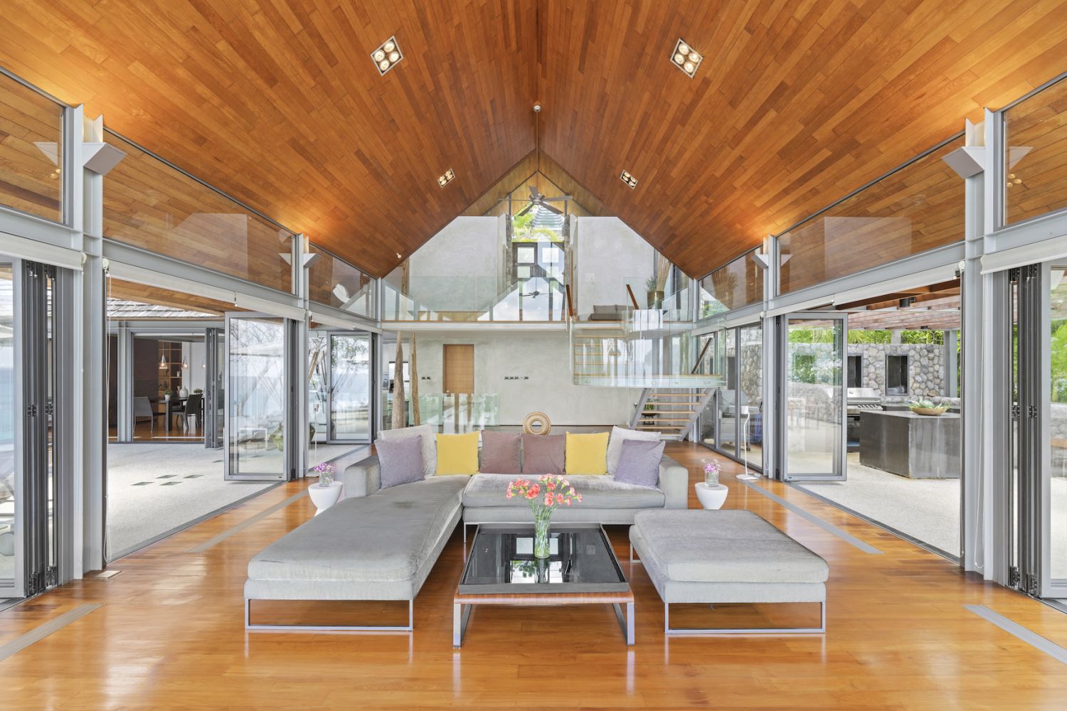 Гости спускаются по лестнице в главную гостиную, просторный атриум двойной высоты, окруженный прозрачными стеклянными панелями, из которых открываются панорамы океана и зеленые виды.