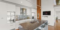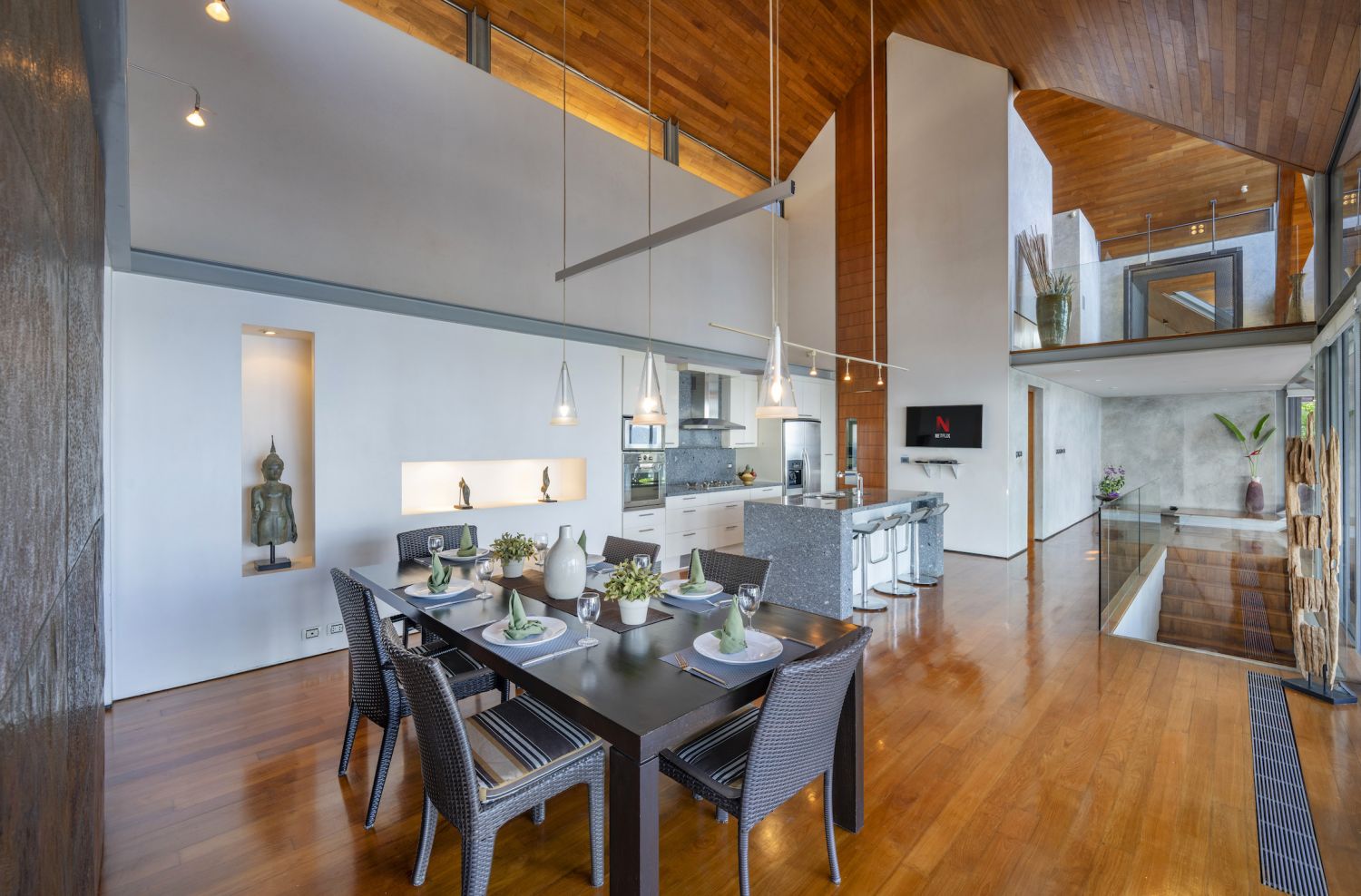 Полностью оборудованная кухня открытой планировки переходит в просторную обеденную зону, причем все пространство становится уникальным благодаря гранитному островному столу для завтрака.