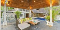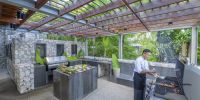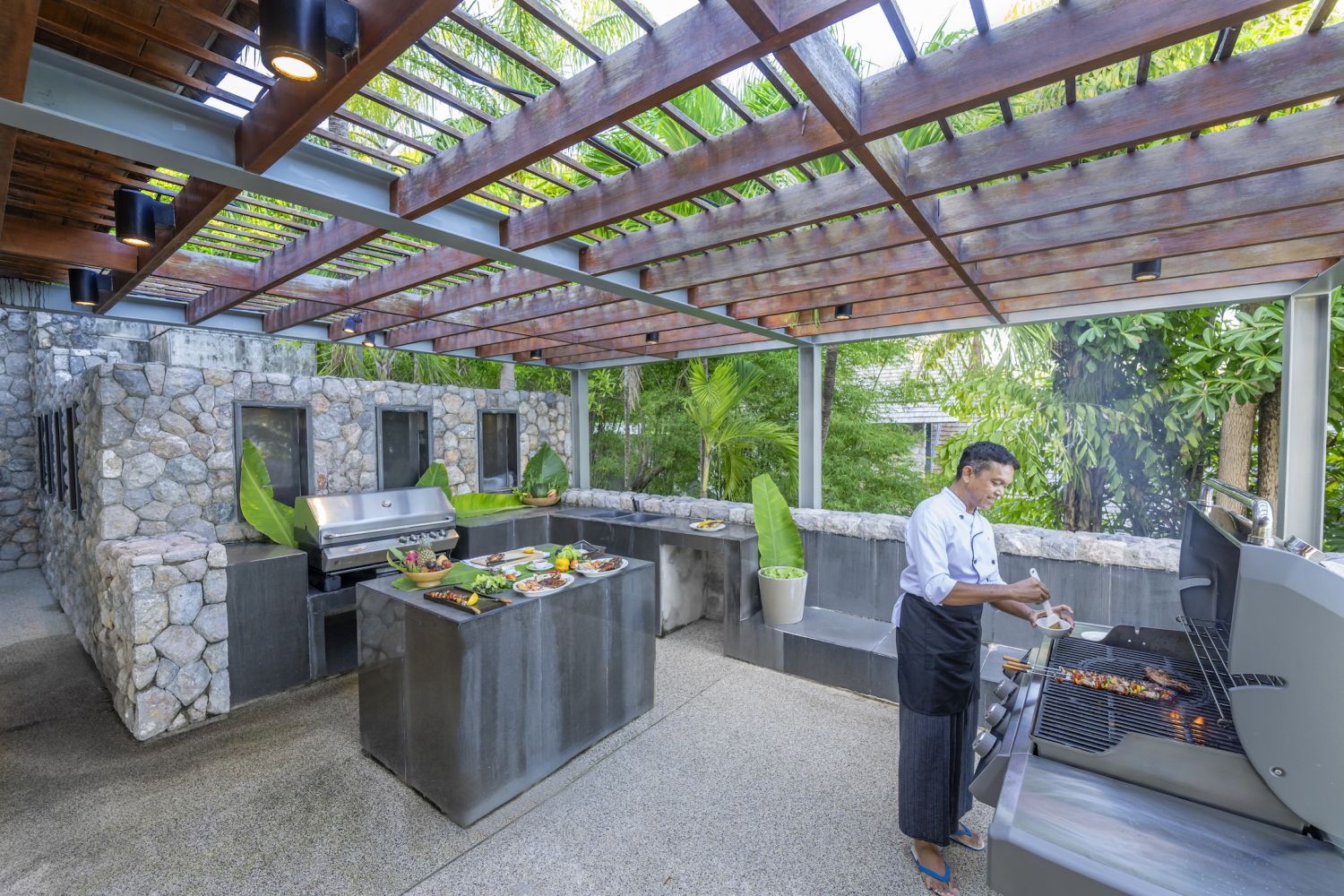 На одной стороне террасы виллы, расположенной по периметру виллы, встроенное барбекю, которое занимает центральную часть обеденной зоны на открытом воздухе.