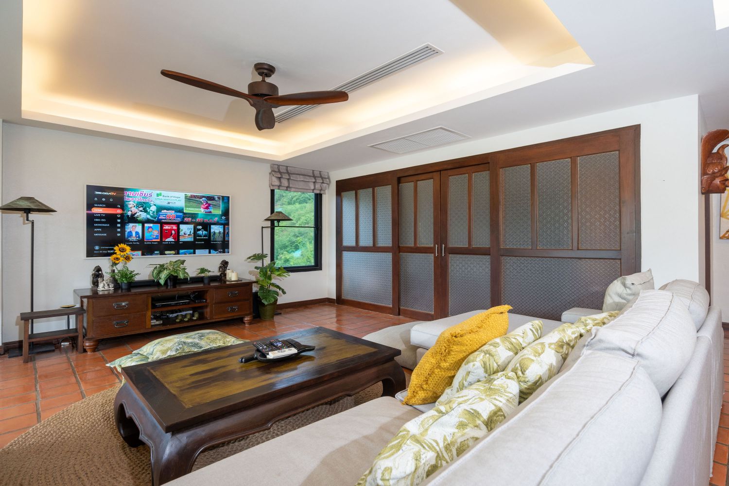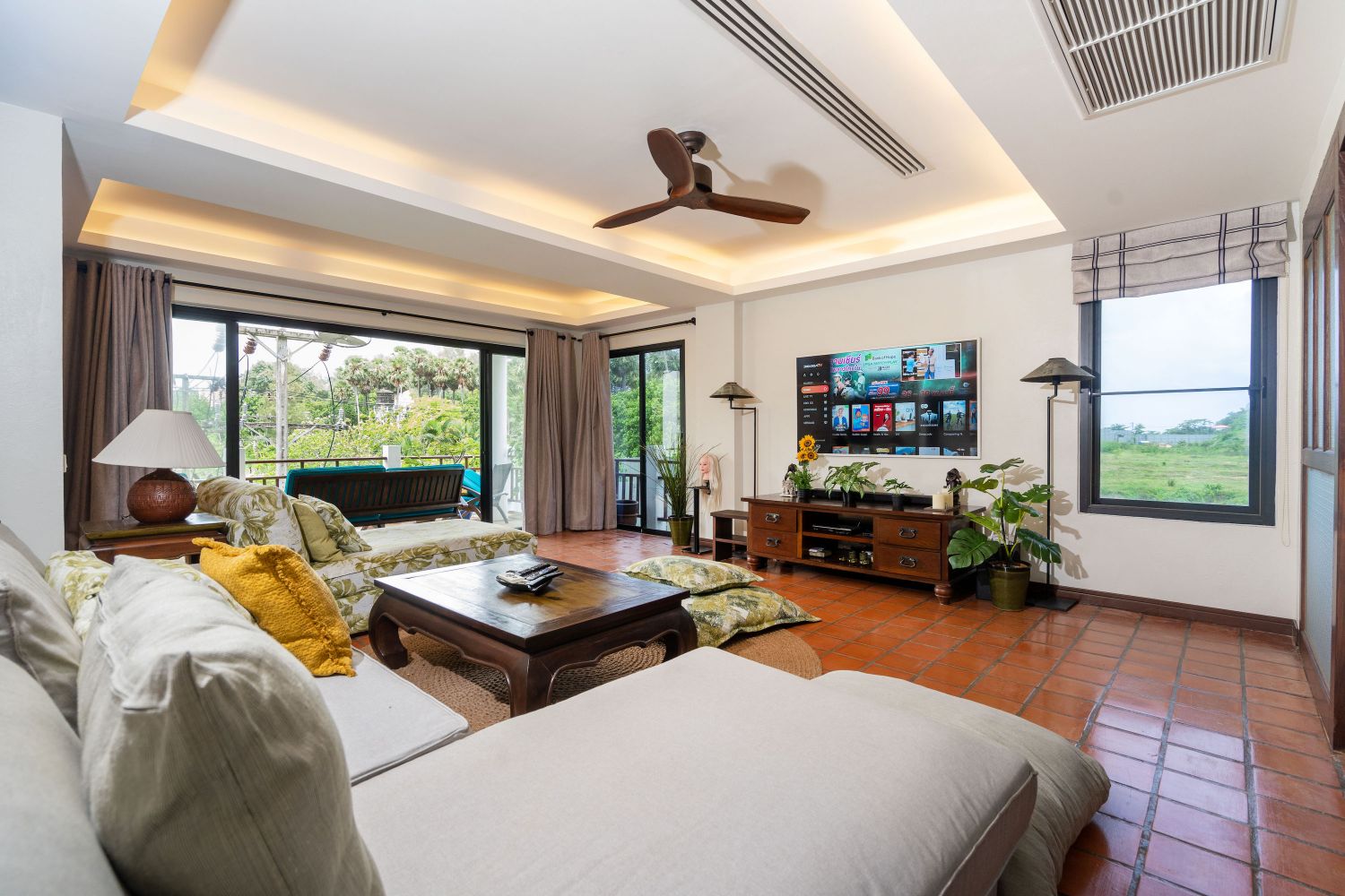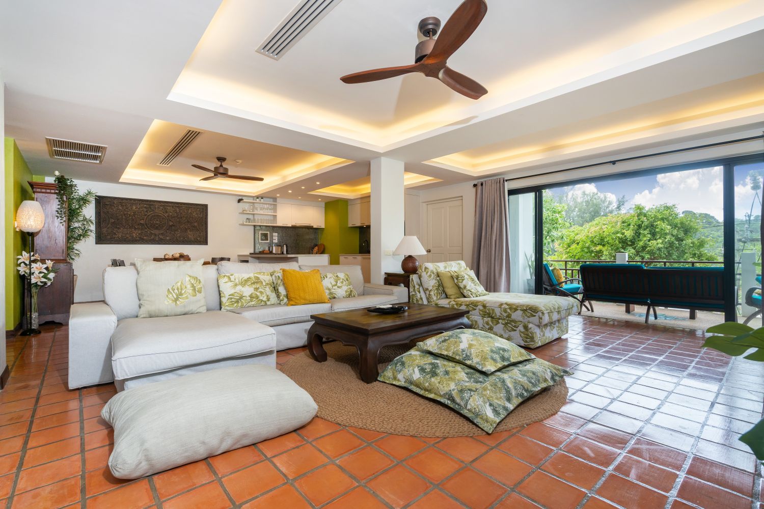 Шикарное пространство гостиной для отдыха всей семьи и открытое пространство на террасе.
