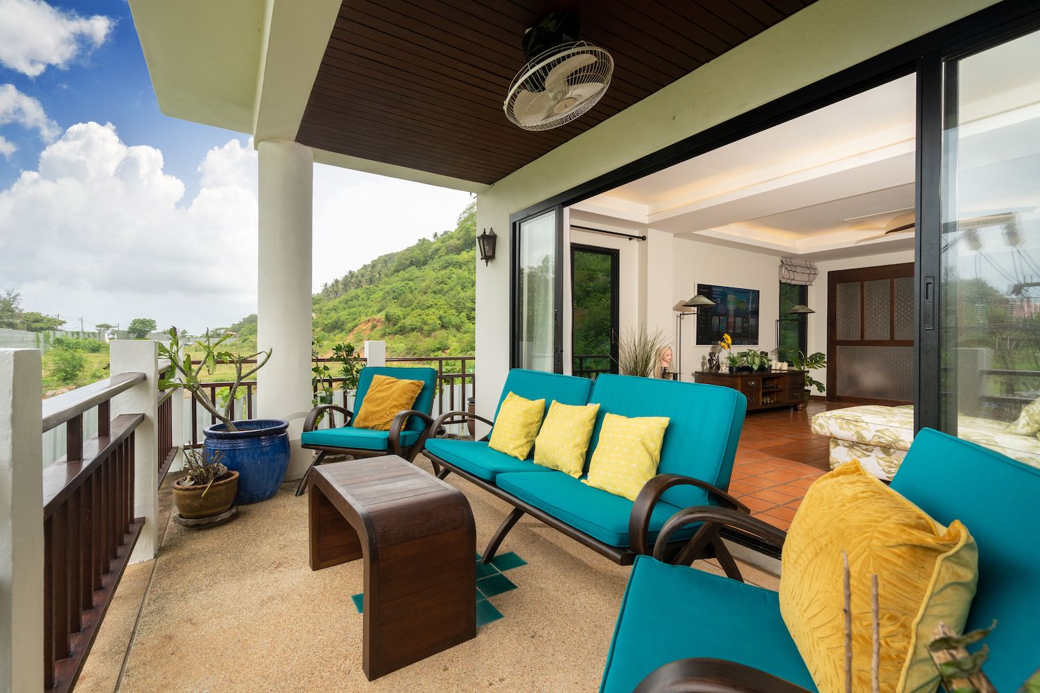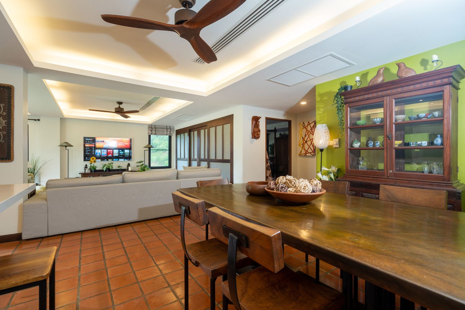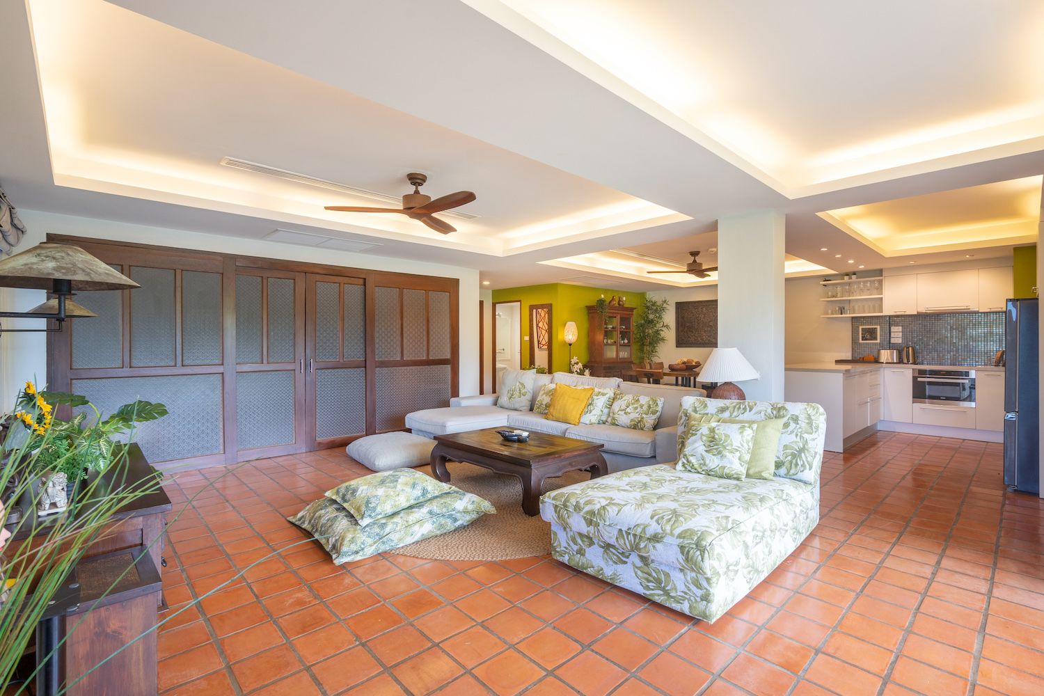 Шикарное пространство гостиной для отдыха всей семьи и открытое пространство на террасе.