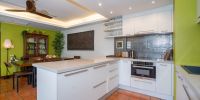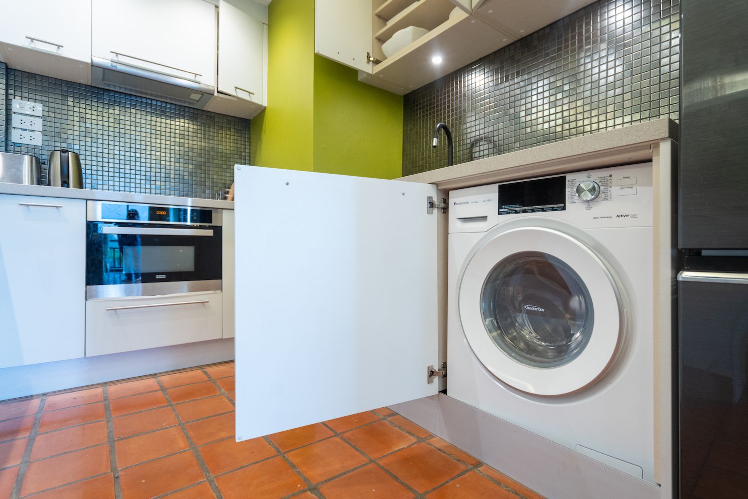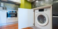 На многофункцмональной кухне имеется абсолютно все для комфортного проживания: варочная панель, стиральная машинка, мелкая бытовая техника.