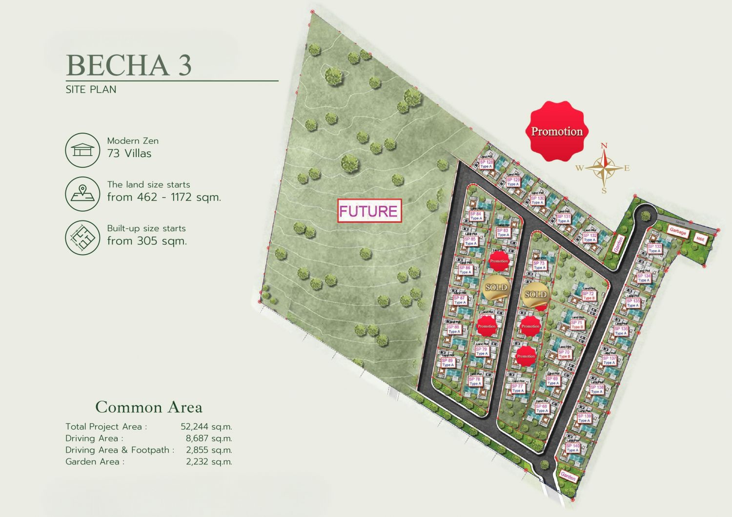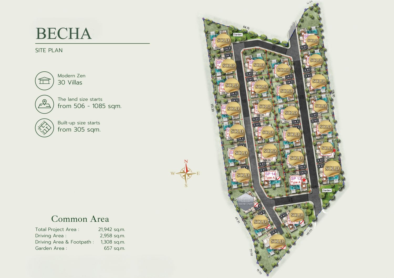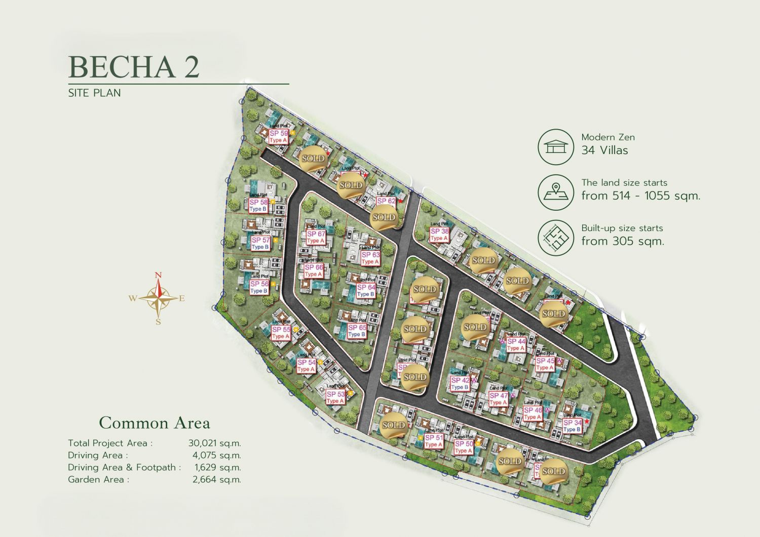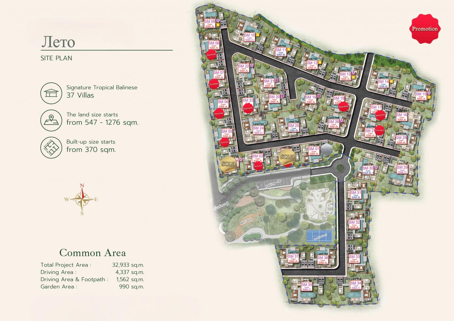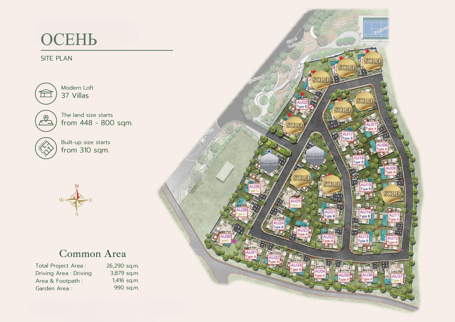 Размер участка под виллу варьируется от 451 до 693 кв.м. Также каждая вилла имеет одно или два парковочных места для автомобилей.