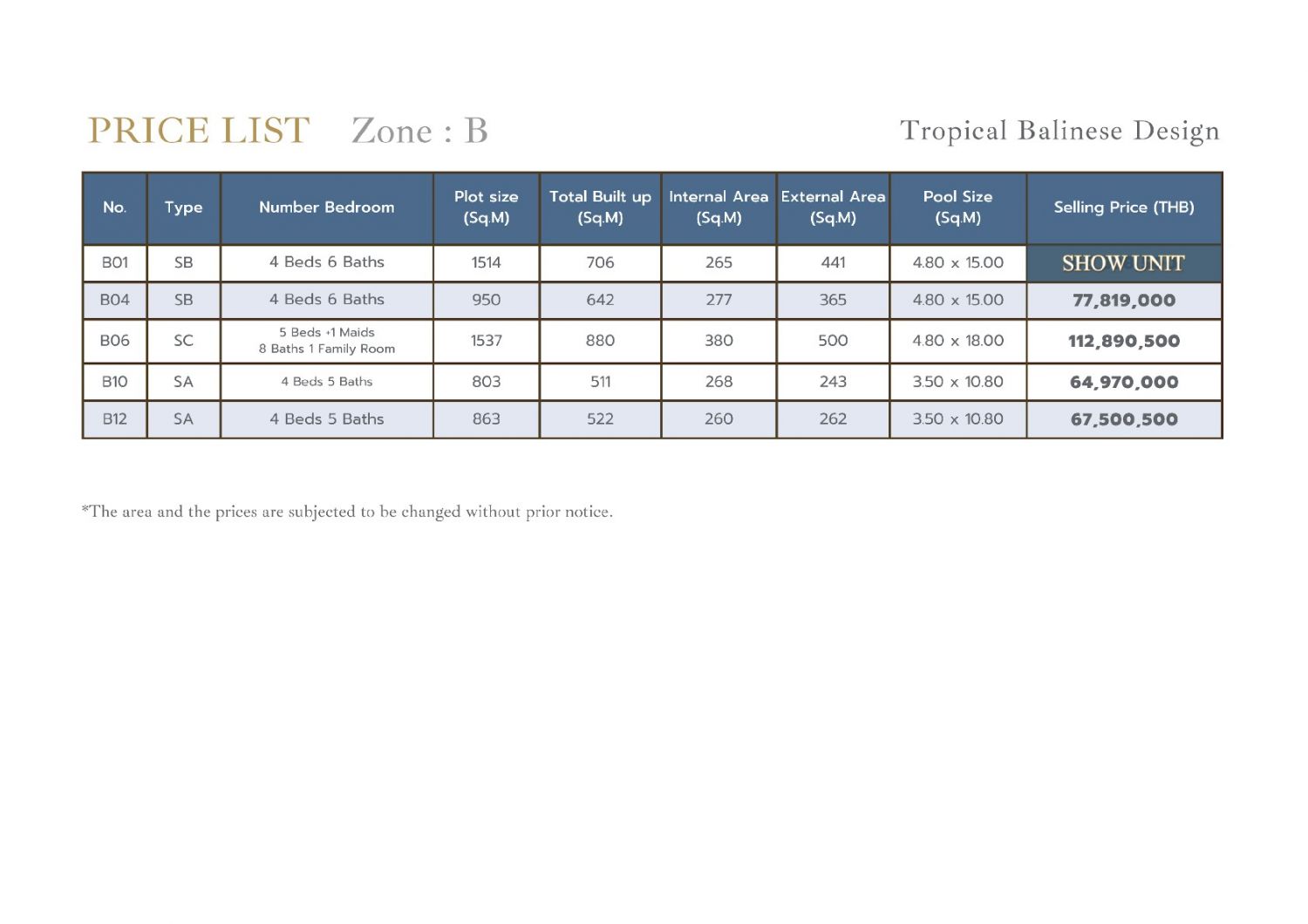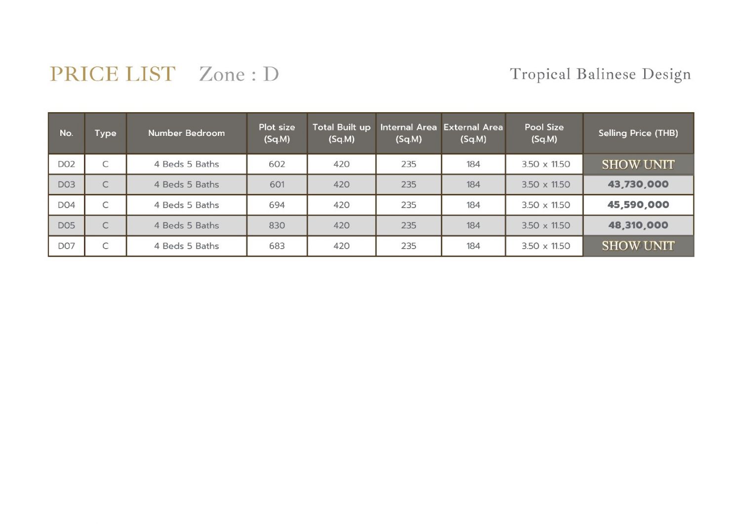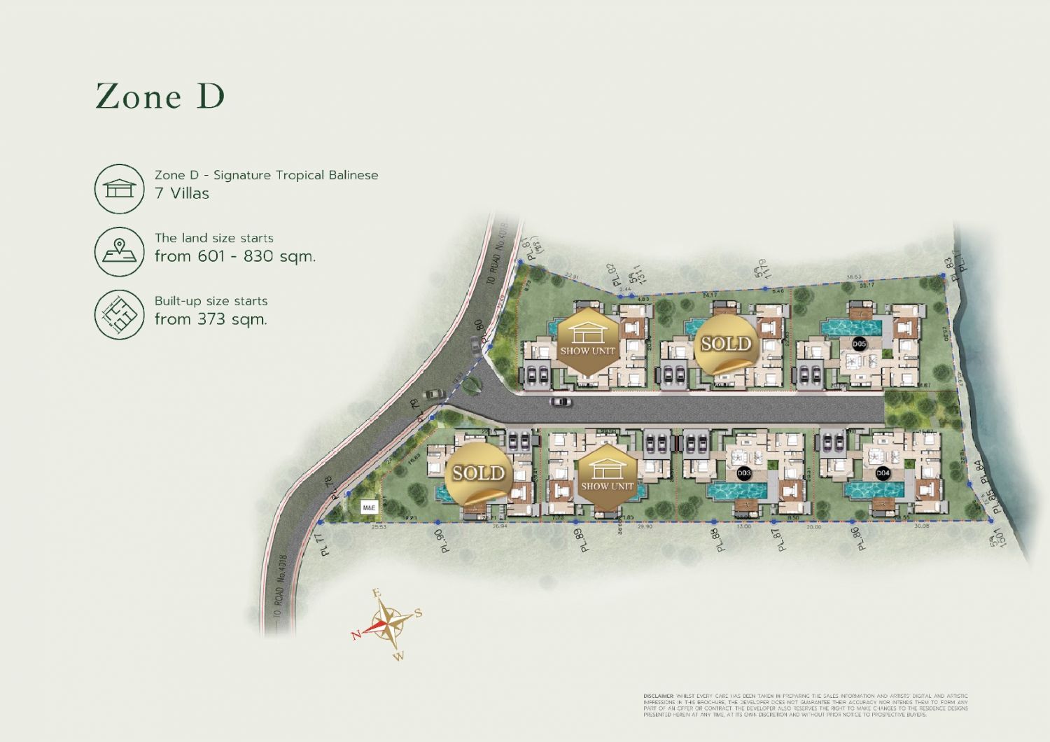 Зона D - это 7 фирменных вилл, выполненных в тропическом балийском стиле. Каждая вилла окружена пышной зеленью и имеет собственный бассейн, предлагая гостям идеальное место для отдыха и релаксации. Размер участков составляет от 601 кв.м до 830 кв.м. Площадь застройки начинается от 373 кв.м. Стоимость начинается от 43 730 000 бат.