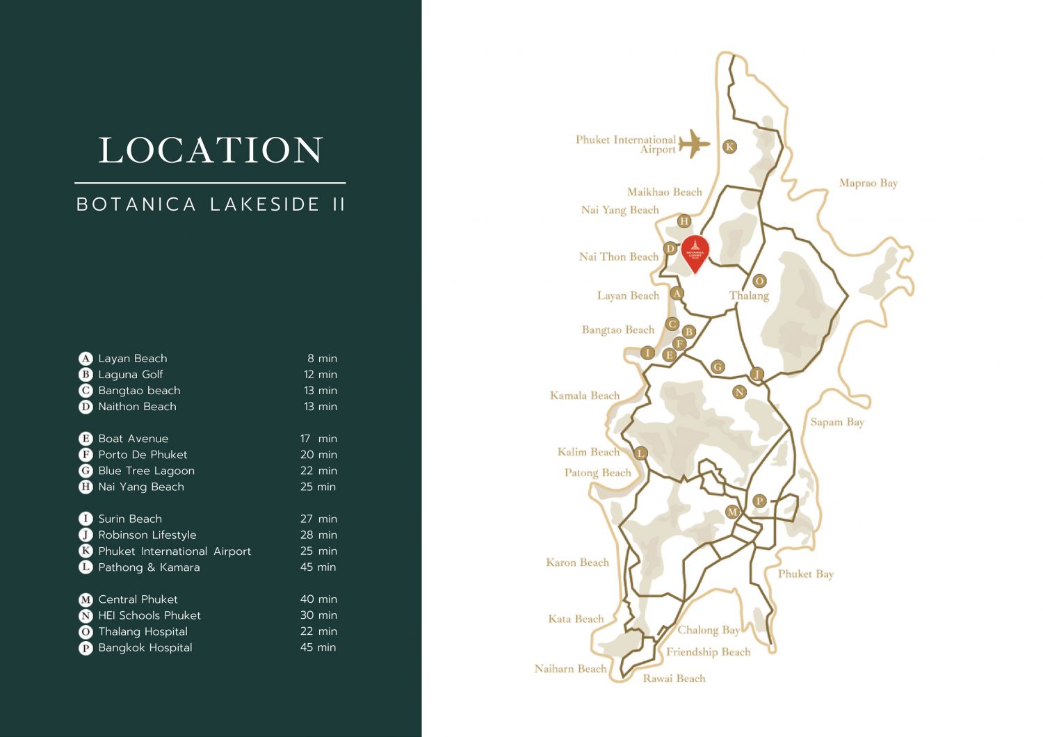 Комплекс вилл Botanica Lakeside 2 расположен в живописном районе острова Пхукет - Бангтао. Этот район известен своей развитой инфраструктурой, живописными пейзажами и близостью к пляжам с белым песком и кристально чистой водой.