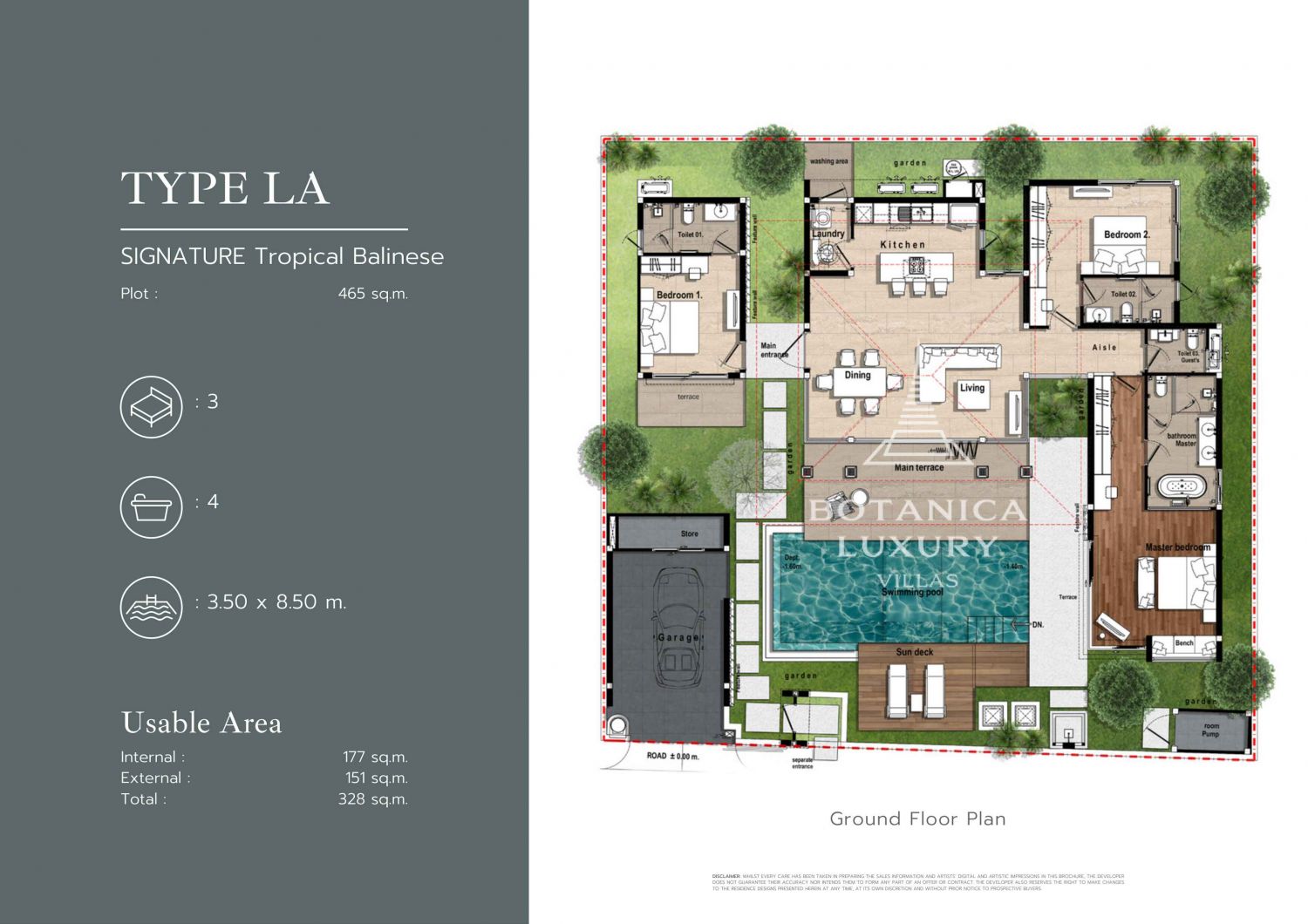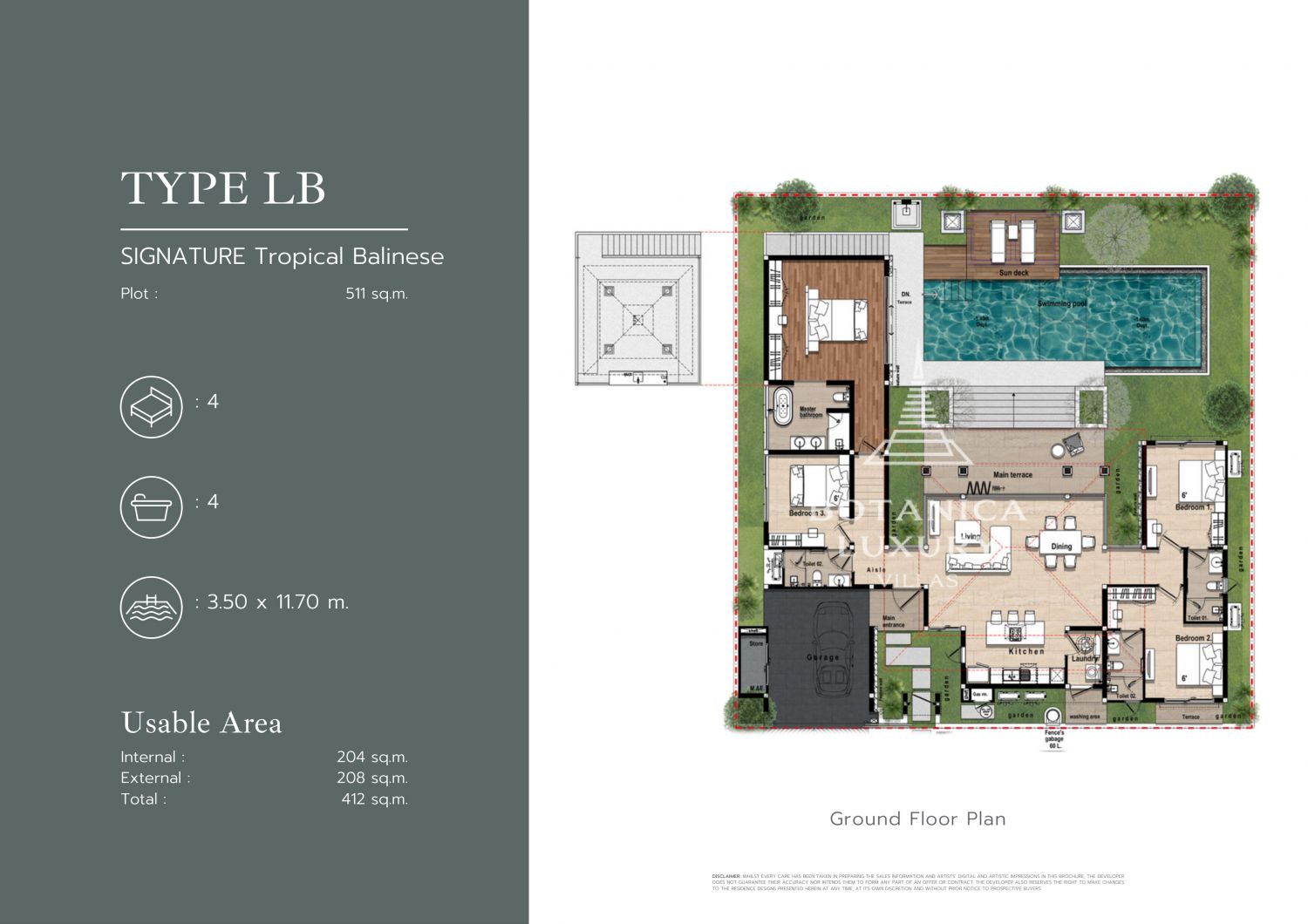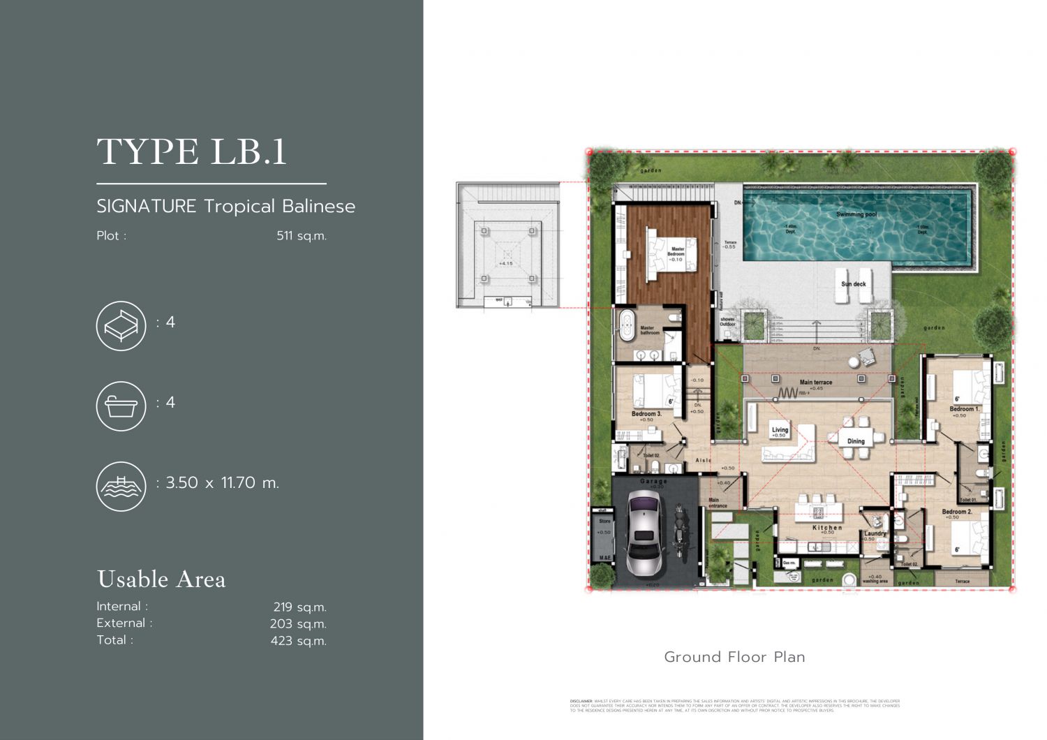 К покупке доступны одноэтажные виллы с 4 спальнями, 4 санузлами, бассейном размером 3,5 х 11,7 м и участком площадью 511 кв.м, которые выделяются своим элегантным дизайном и просторными планировками. Также у вилл предусмотрено одно парковочное место.