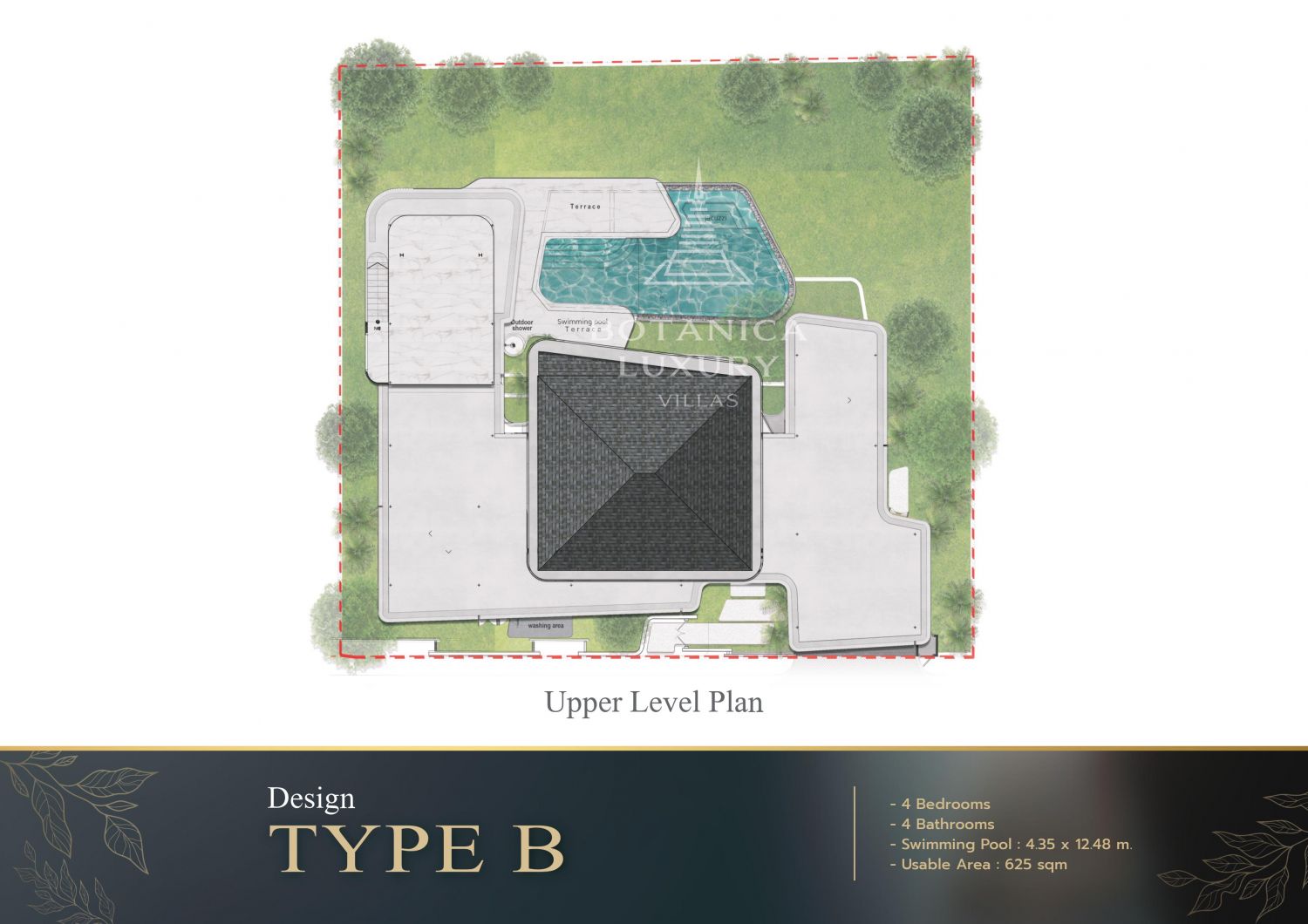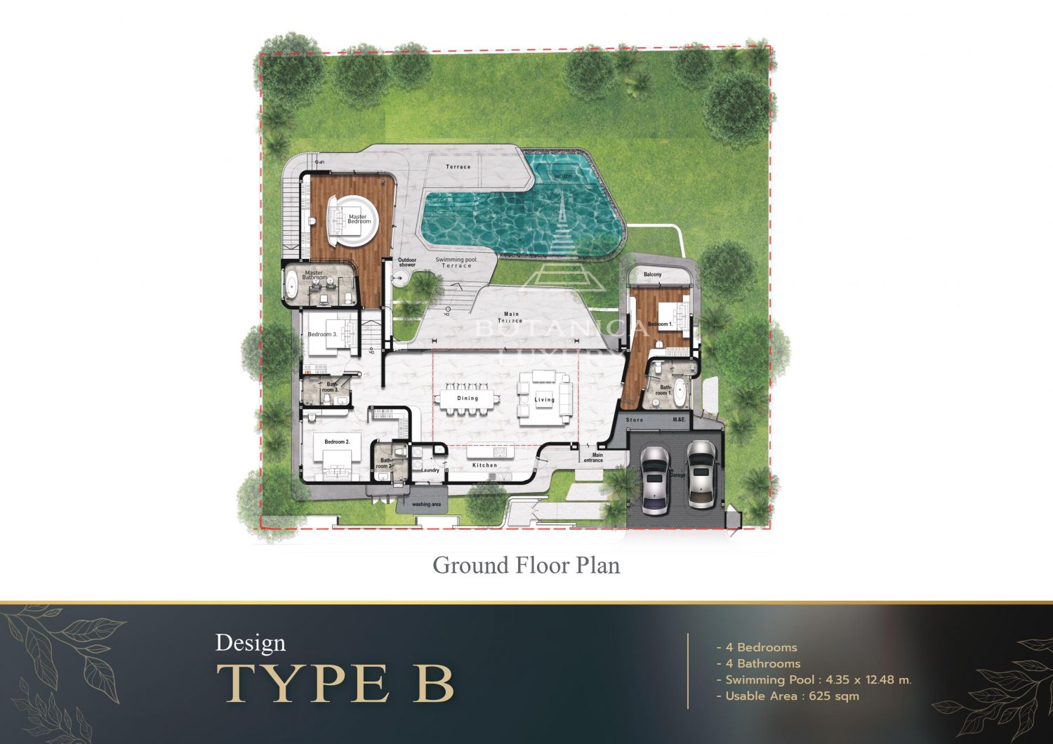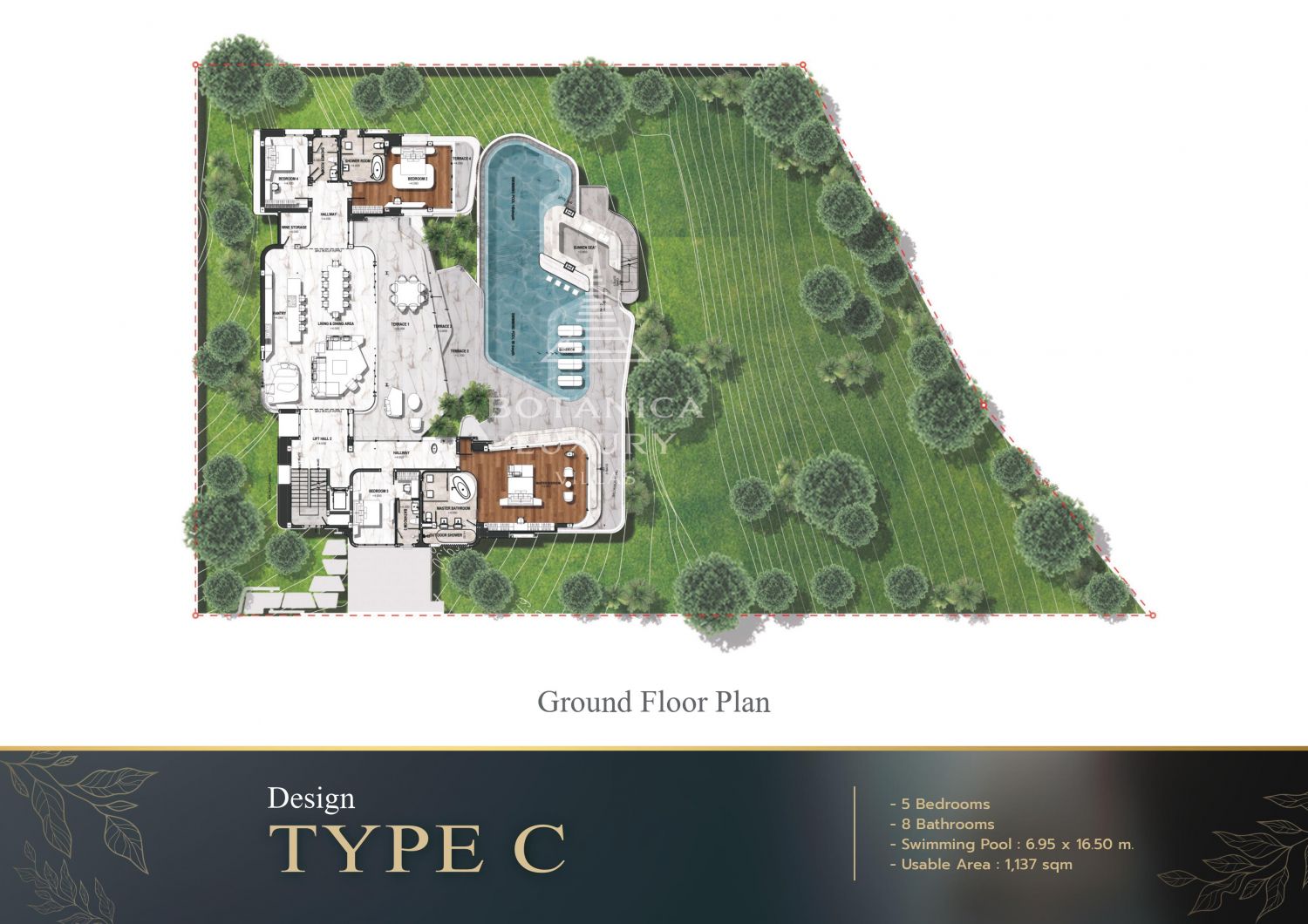 Площадь застройки виллы начинается от 625 квадратных метров, обеспечивая обилие пространства для комфортной жизни.