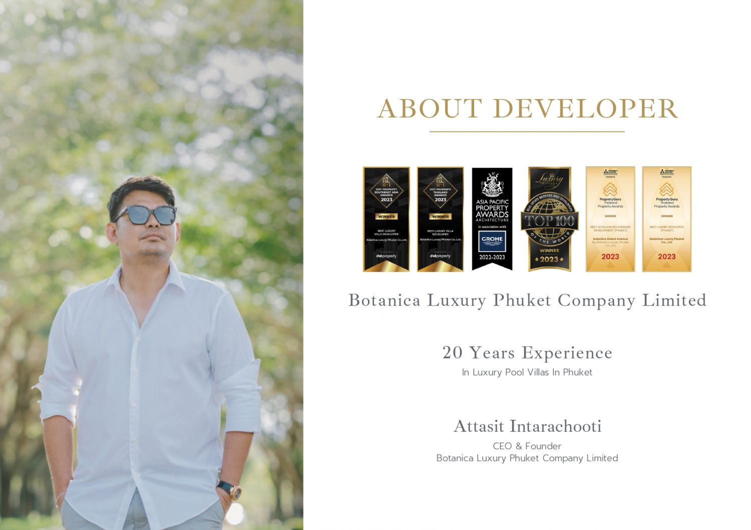 Botanica Luxury Phuket Company Limited — это престижный застройщик с опытом работы более 20-ти лет, специализирующийся на элитной недвижимости на Пхукете. Компания известна своими уникальными проектами, которые гармонично сочетают современный дизайн и природные особенности региона. Благодаря высоким стандартам качества и вниманию к деталям, Botanica Luxury Phuket завоевала репутацию надежного партнера.