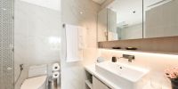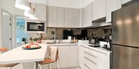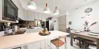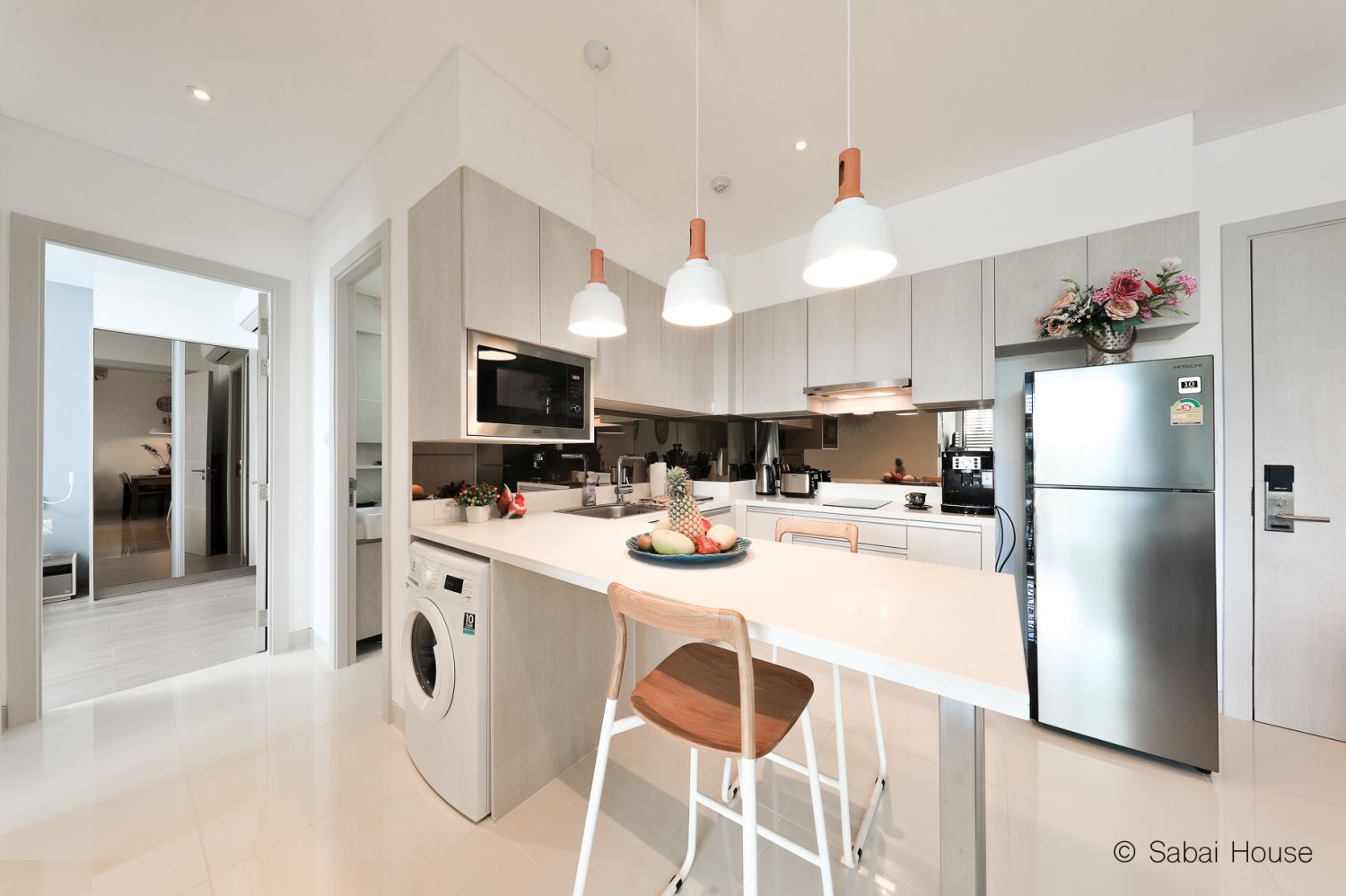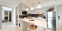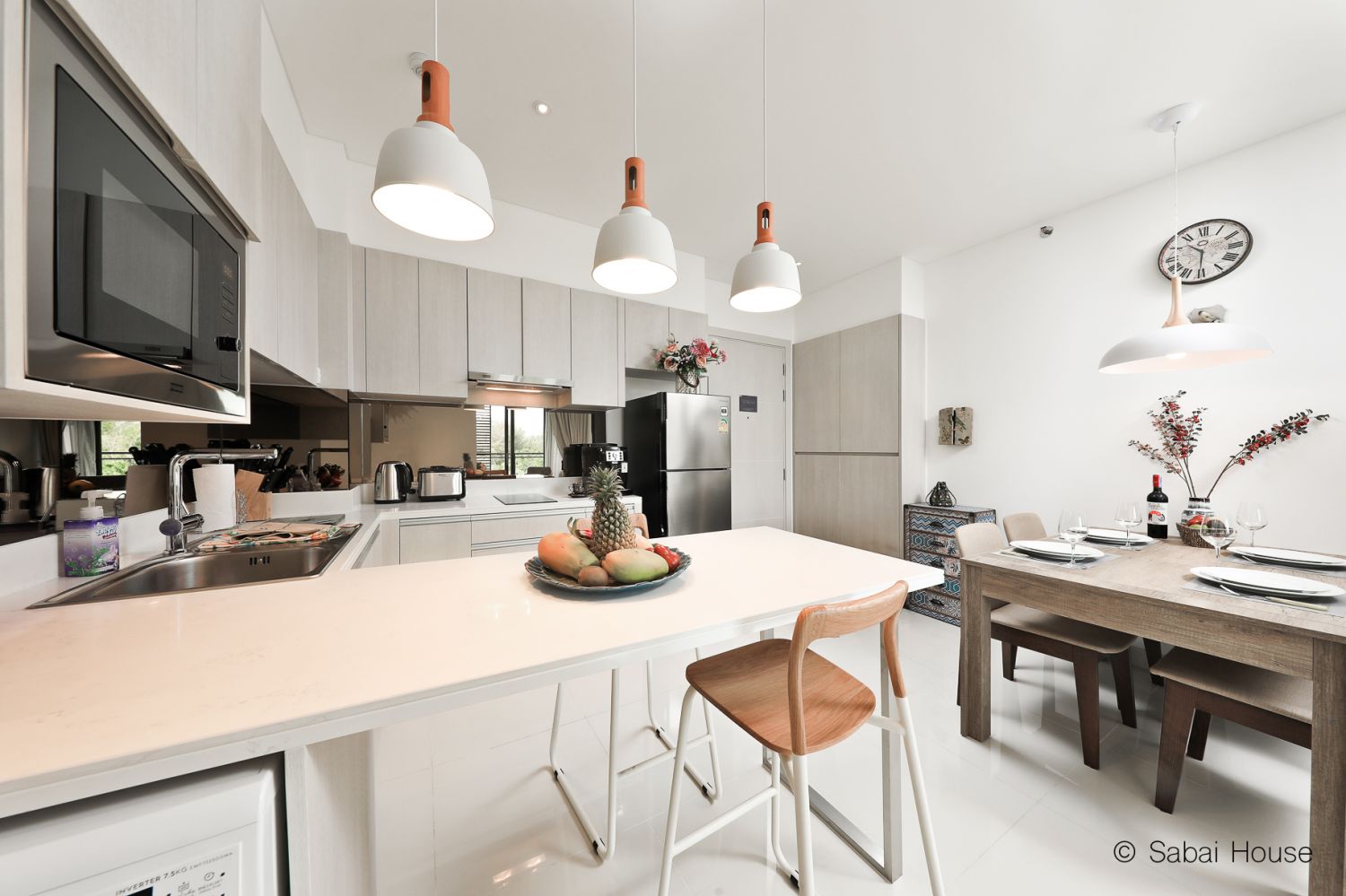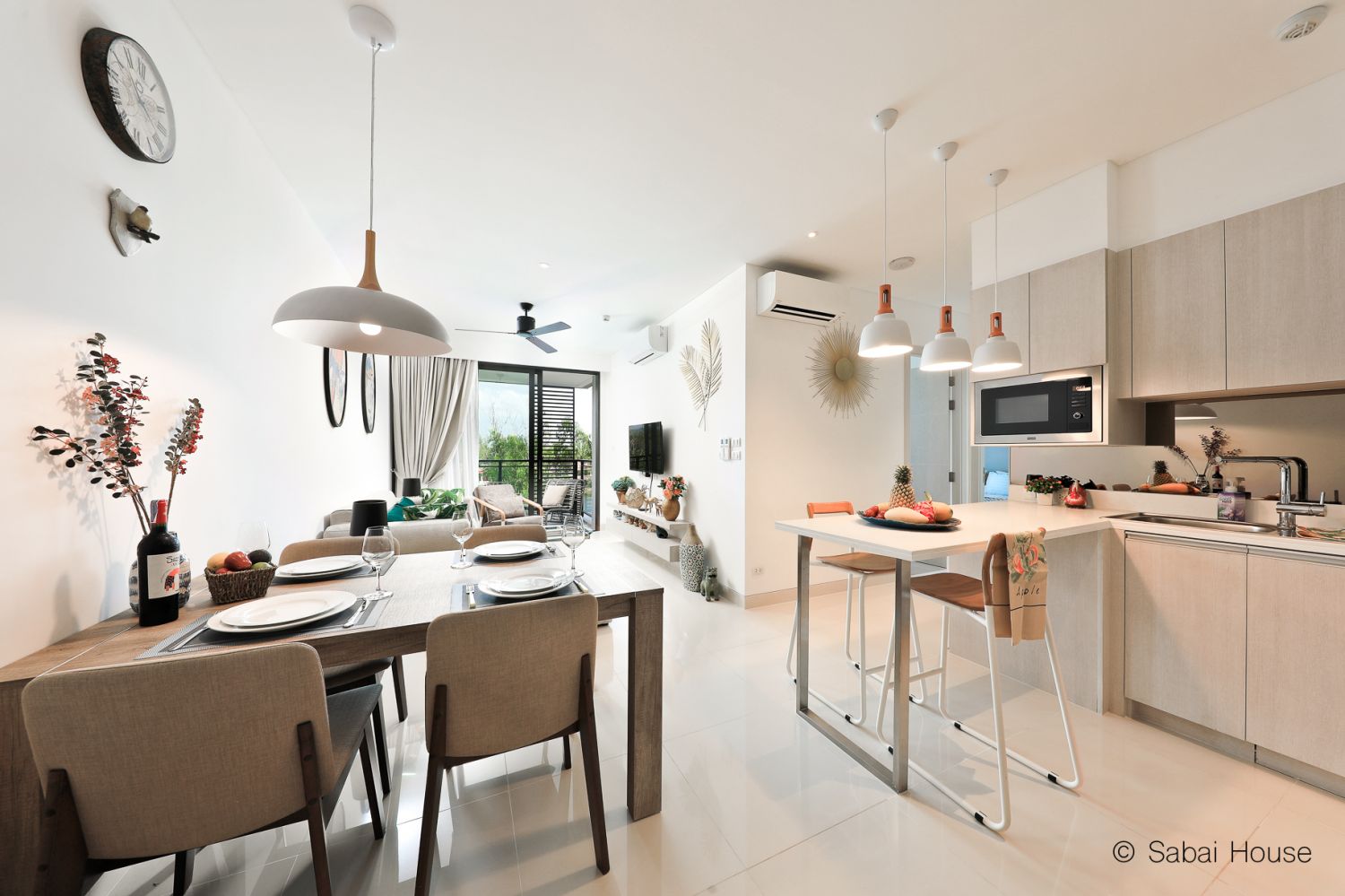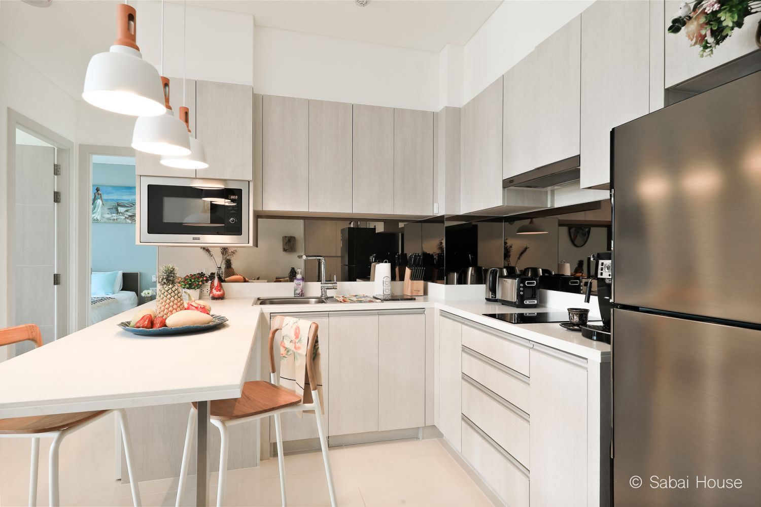 Кухня в квартире объединена с гостиной и обеденной зоной.
