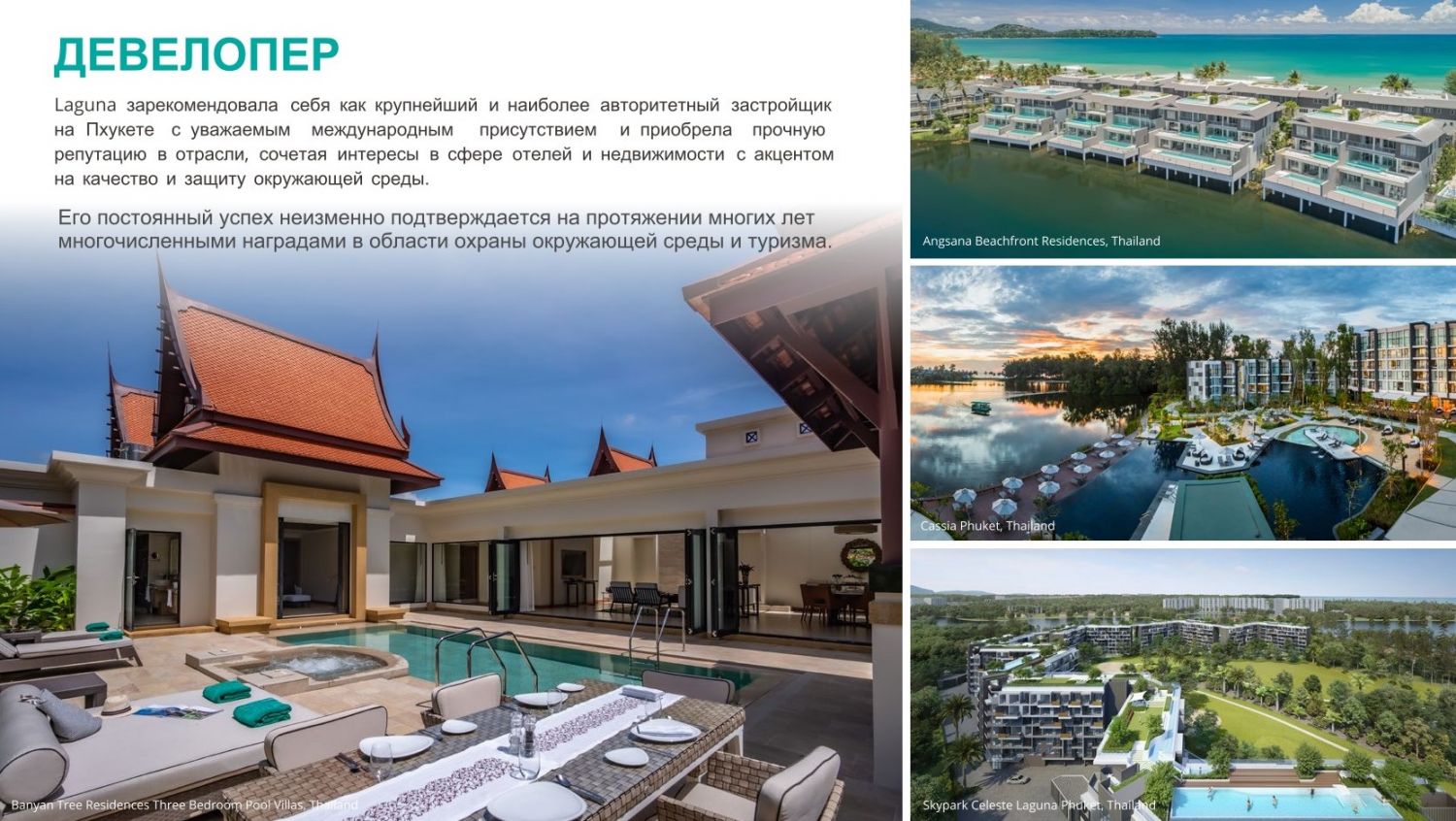 На Пхукете все началось в 1984 году, когда компания купила 550 акров земли на месте бывший оловянных рудников. Ныне это отели Angsana, Dusit Thani, Saii, Cassia, гольф поля и резиденции.