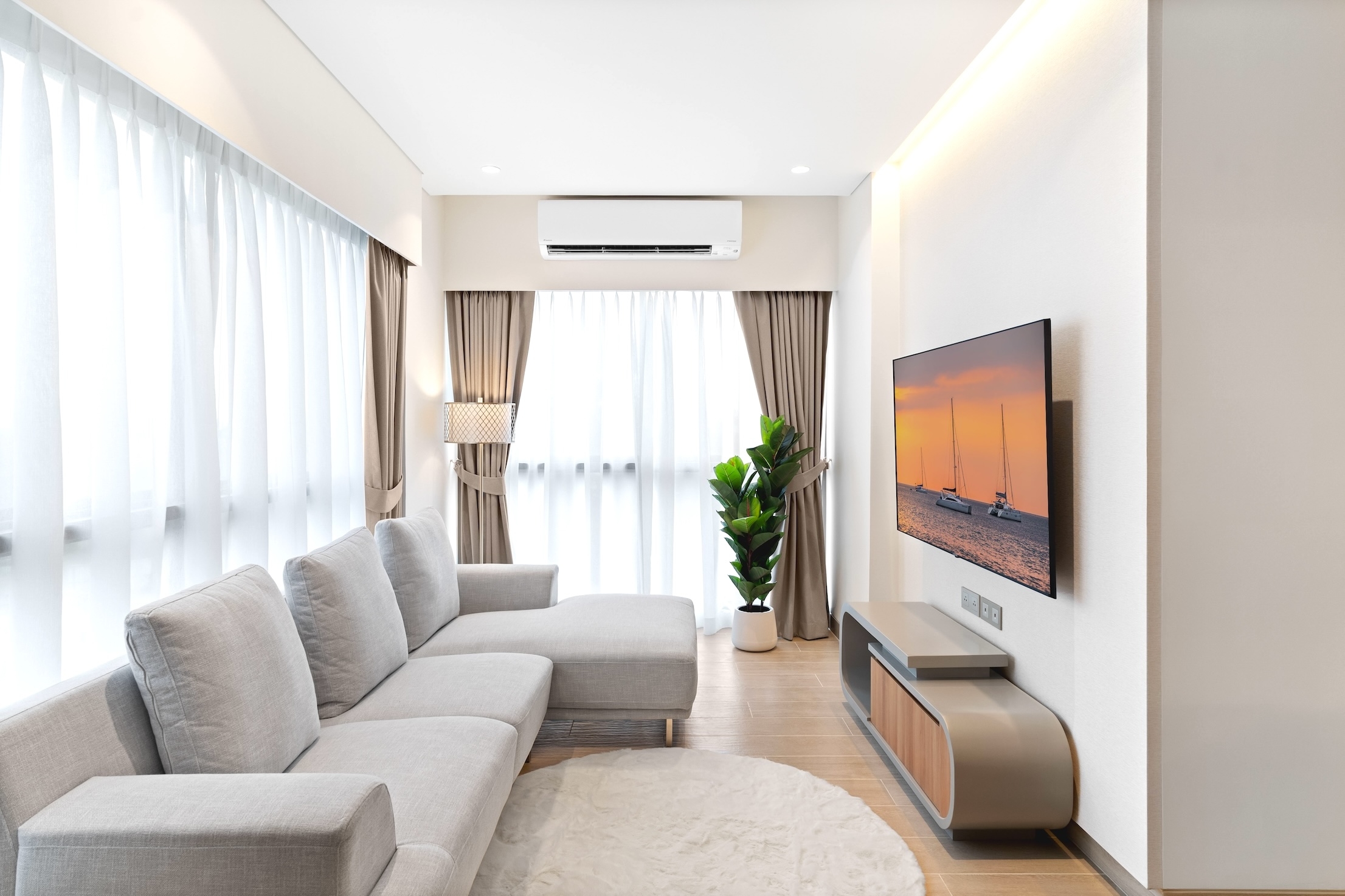 Тут хорошо: благородный текстиль на окнах, мягкий диван, декоративно-прикладные элементы из натурального дерева, современный смарт тв.