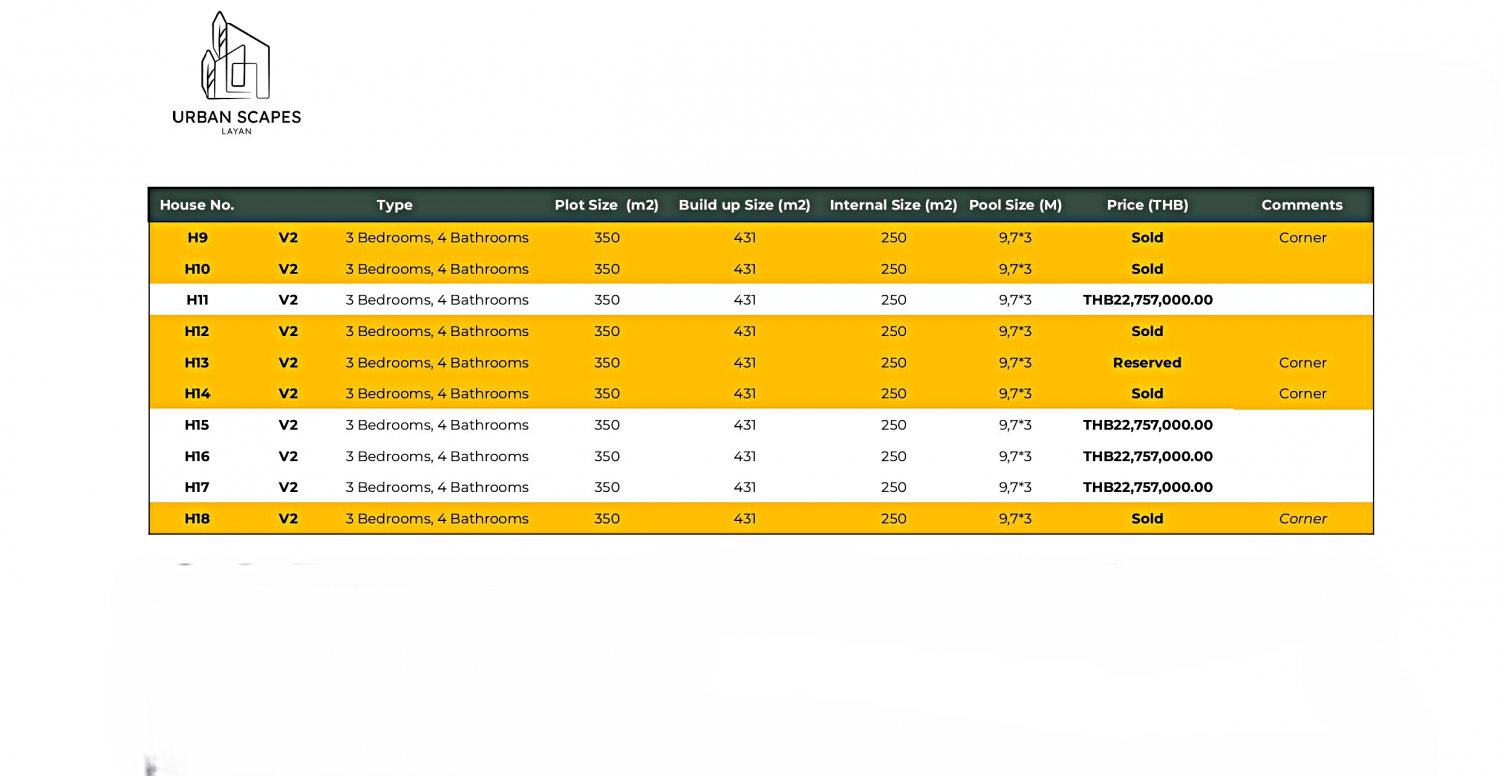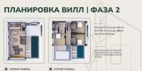 Каждая вилла располагает тремя спальнями и тремя санузлами, а также гостиной совмещенной с обеденной зоной и парковочным местом для автомобиля.