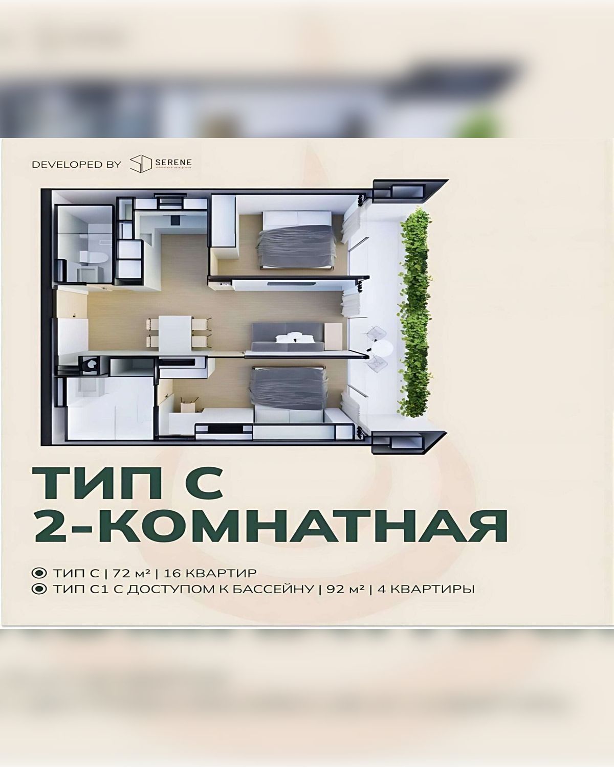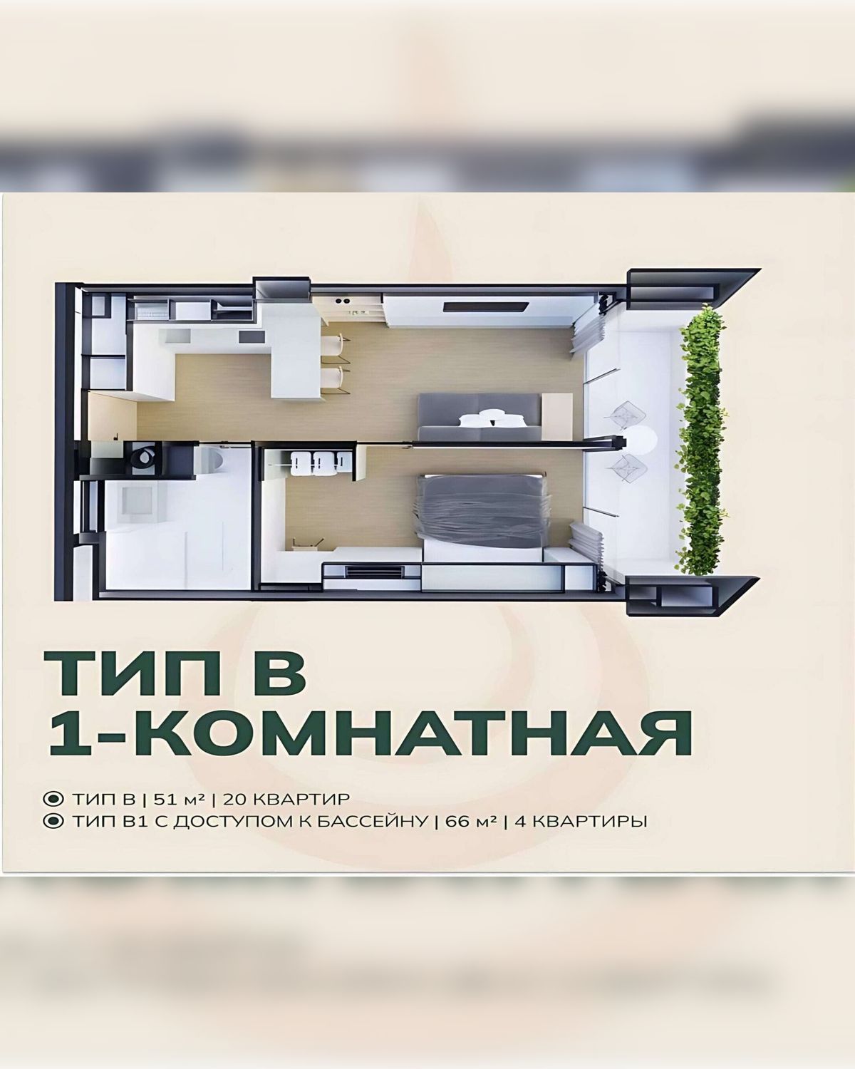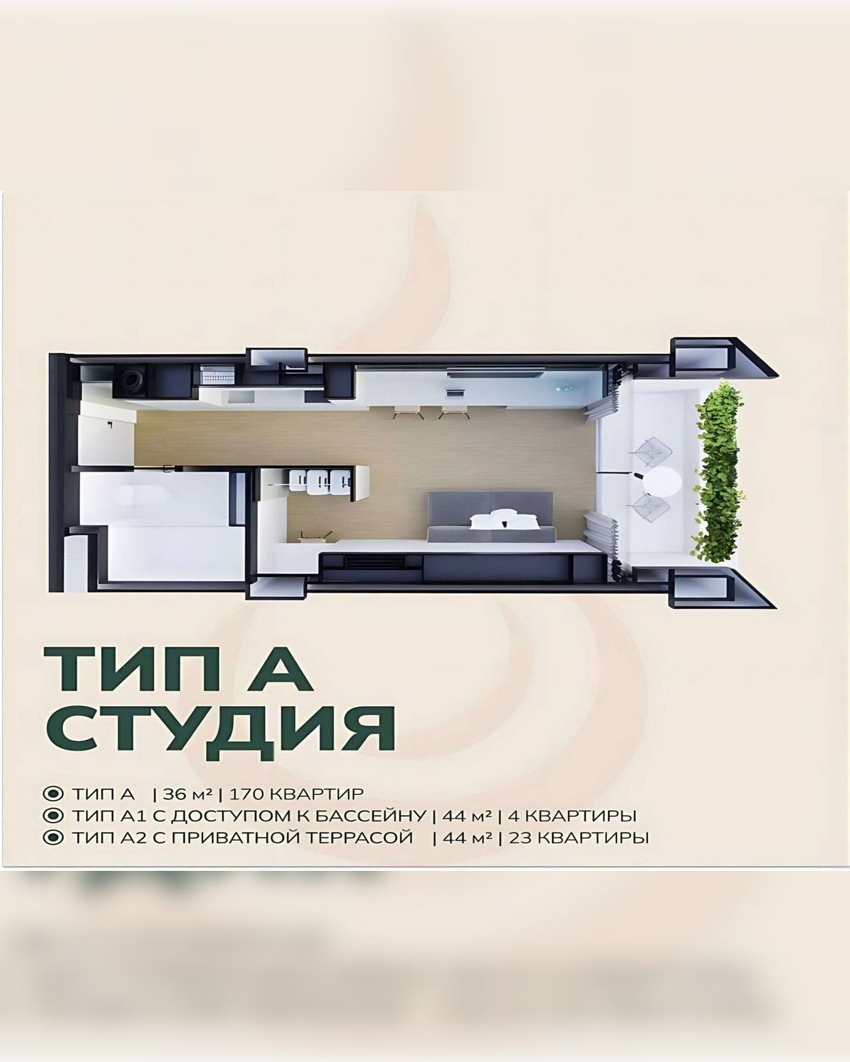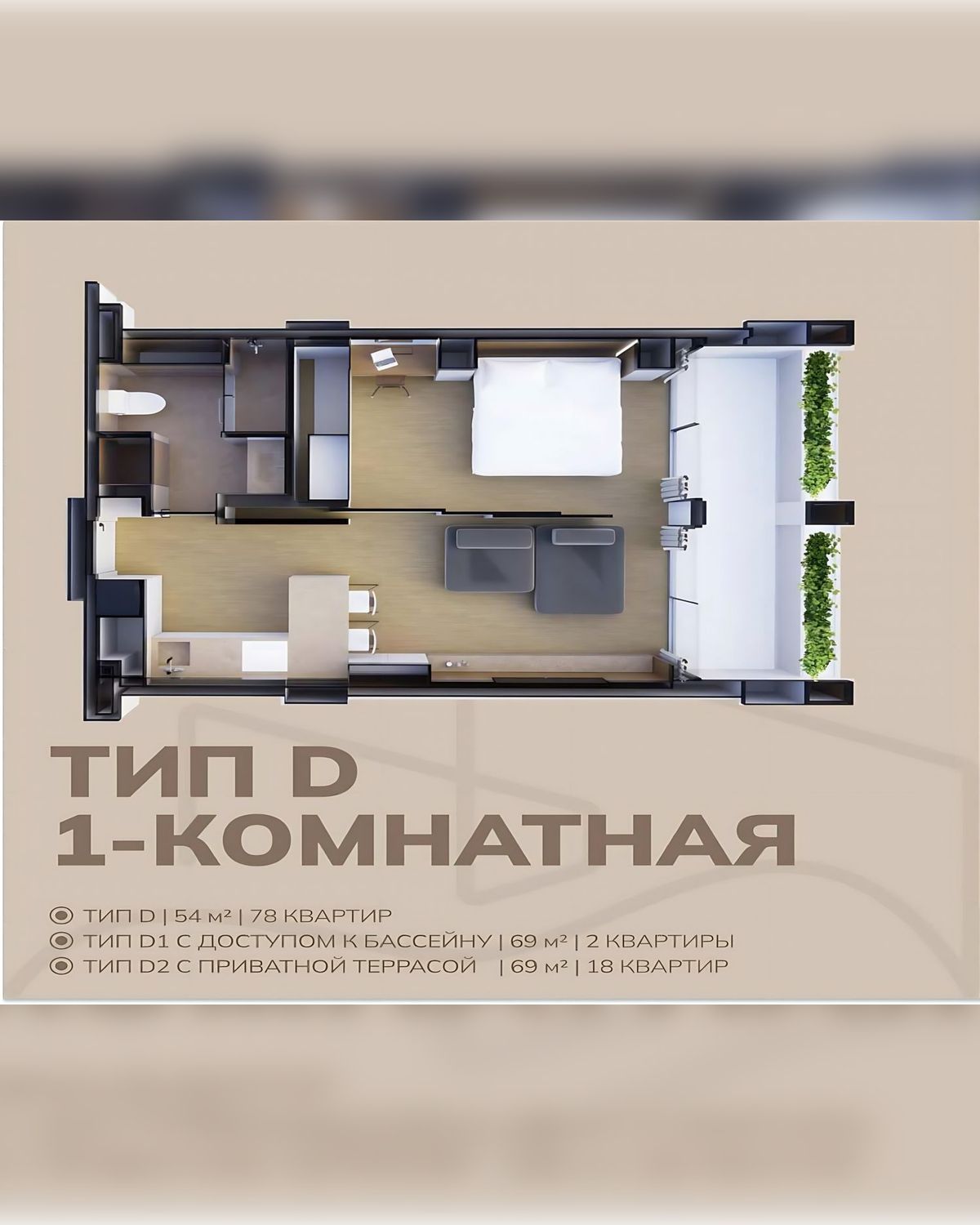 К покупке предлагается множество вариантов планировок: от уютных студий до просторных двухкомнатных квартир, включая эксклюзивные апартаменты с доступом к бассейну или с приватной террасой.