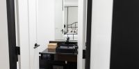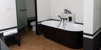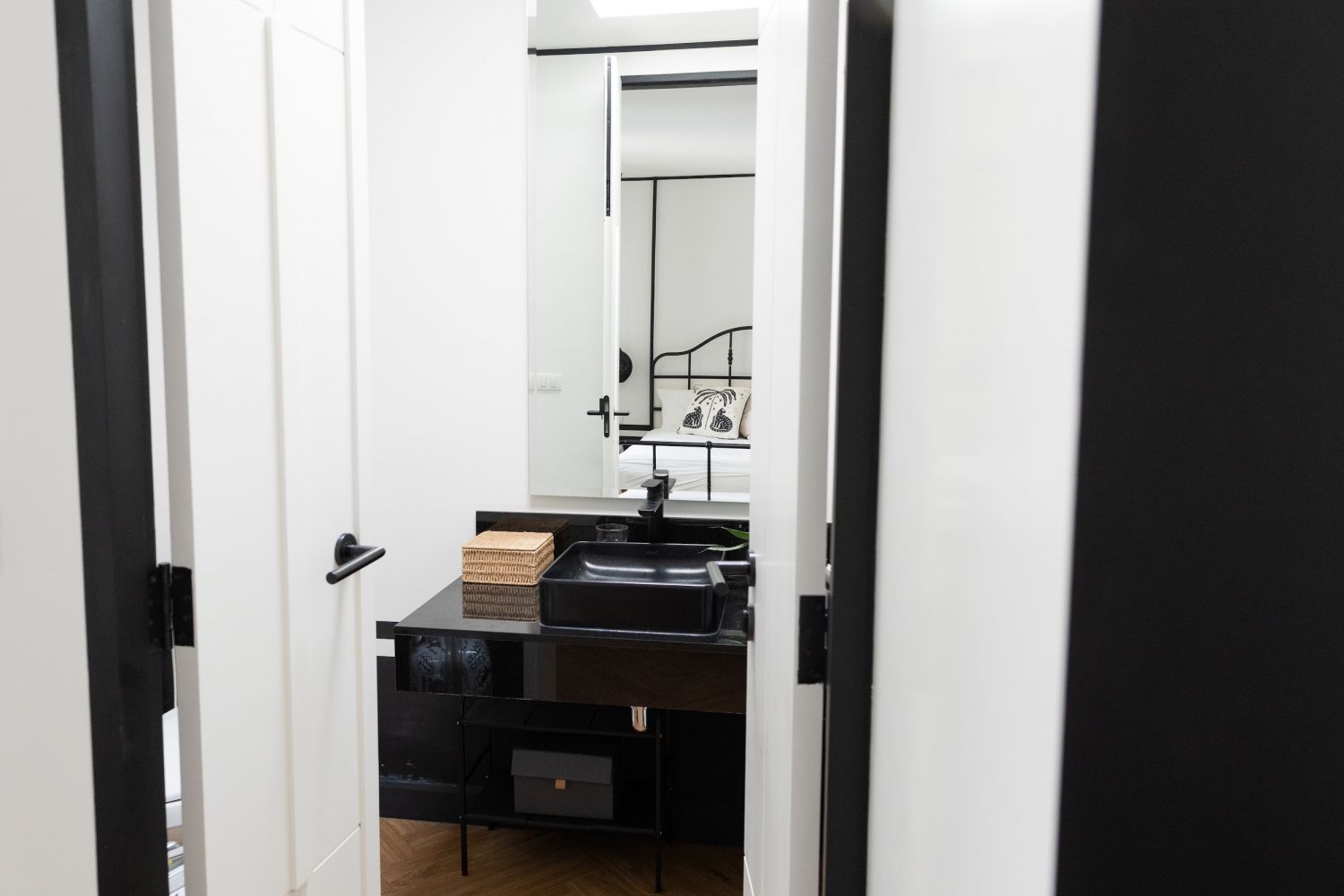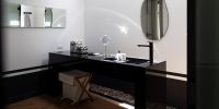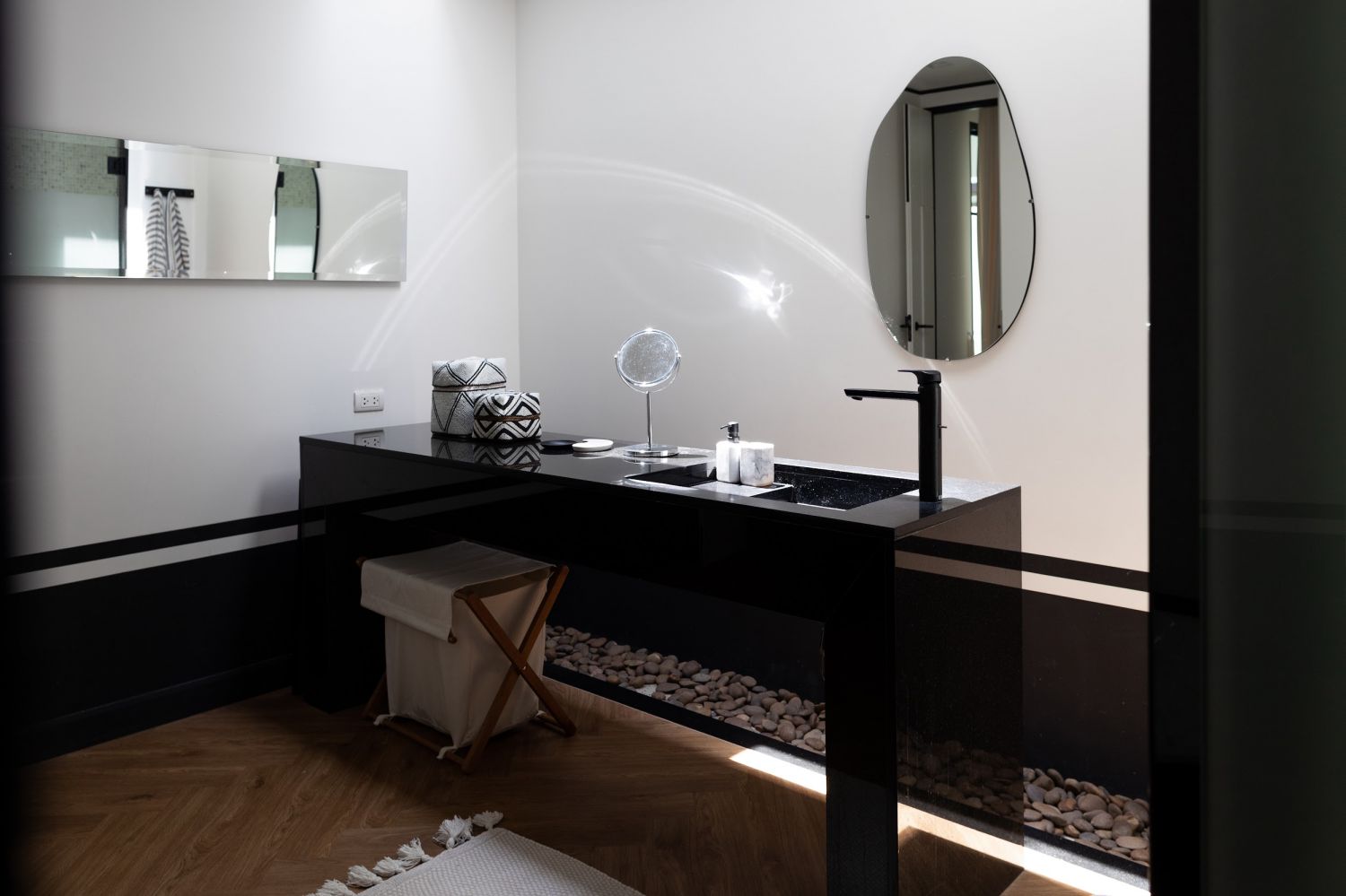 Санузел, выполненный в черно-белых цветах, восхищает роскошной ванной, просторным туалетом и изысканными, удобными зеркалами.
