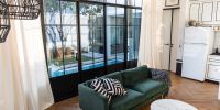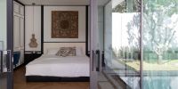 Отсюда открывается выход к бассейну, где можно насладиться зеленой лужайкой и кристально чистой водой.