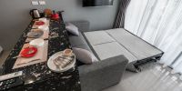 В этих апартаментах первый раз, было ощущение, что они новые, что мы первые гости, оказалось нет, просто девочки постоянно поддерживают все в идеальном состоянии, освежают ремонт, дополняют/меняют текстиль, посуду и т.д. количество полотенец и белизна приятно удивила, стилизованные тарелочки, бокалы- это все делает настроение! На балконе удобные стулья и большой стол, все в безупречном состоянии.