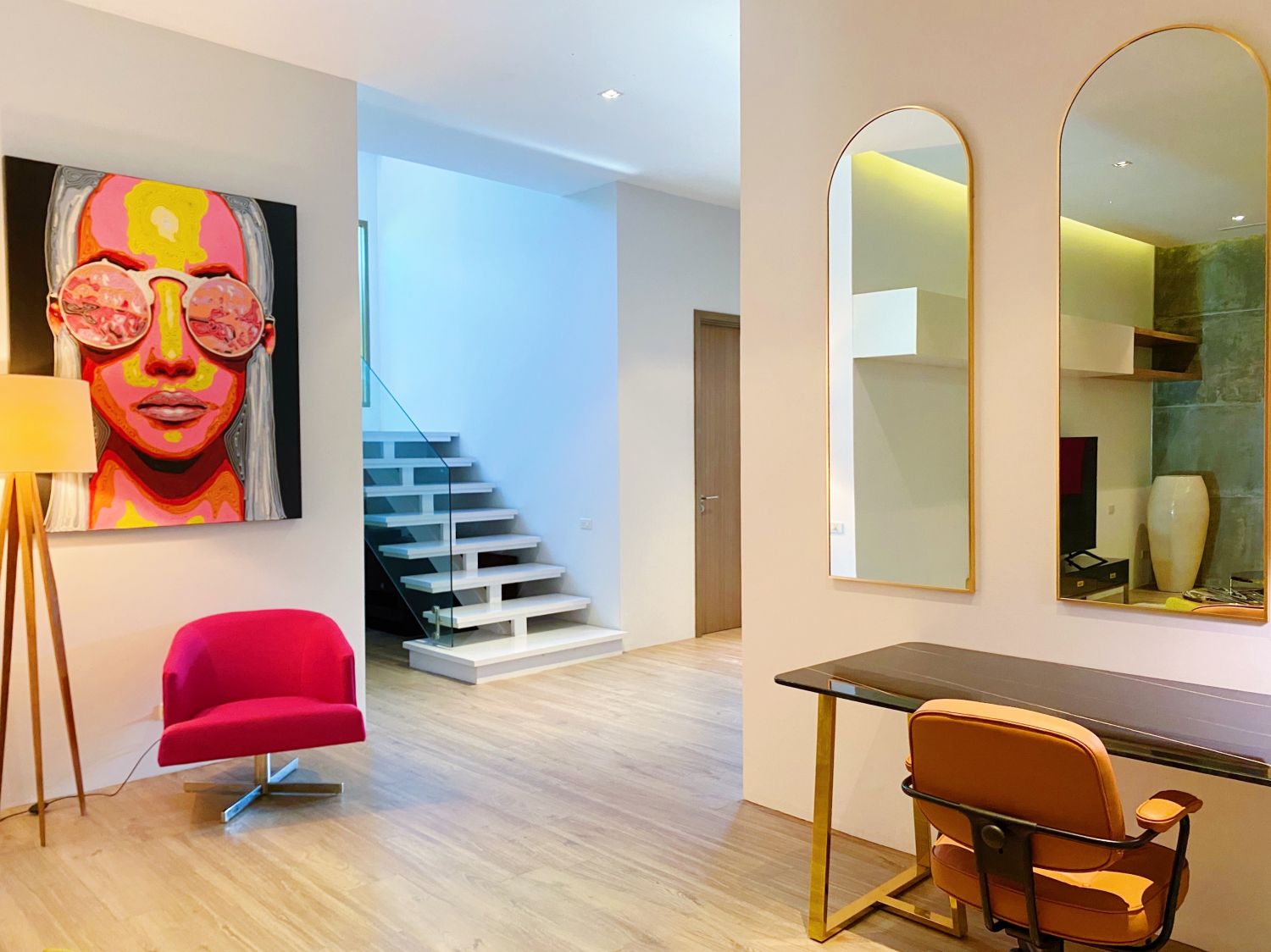 На нижнем этаже имеется и своя гостиная, которая может быть как кинотеатром, так и рабочей зоной.