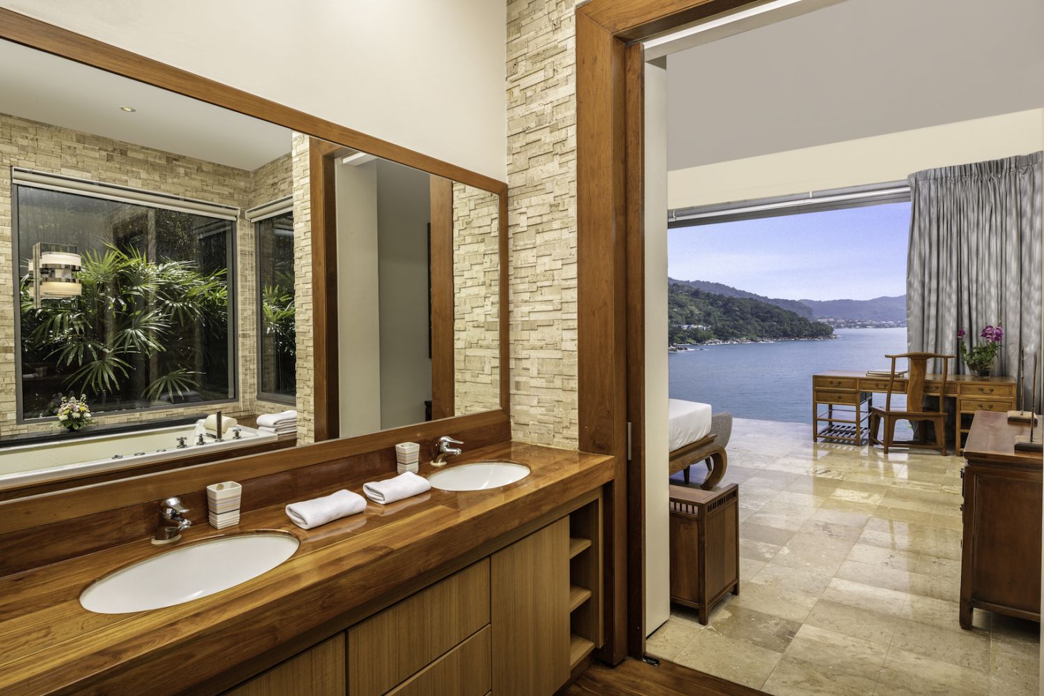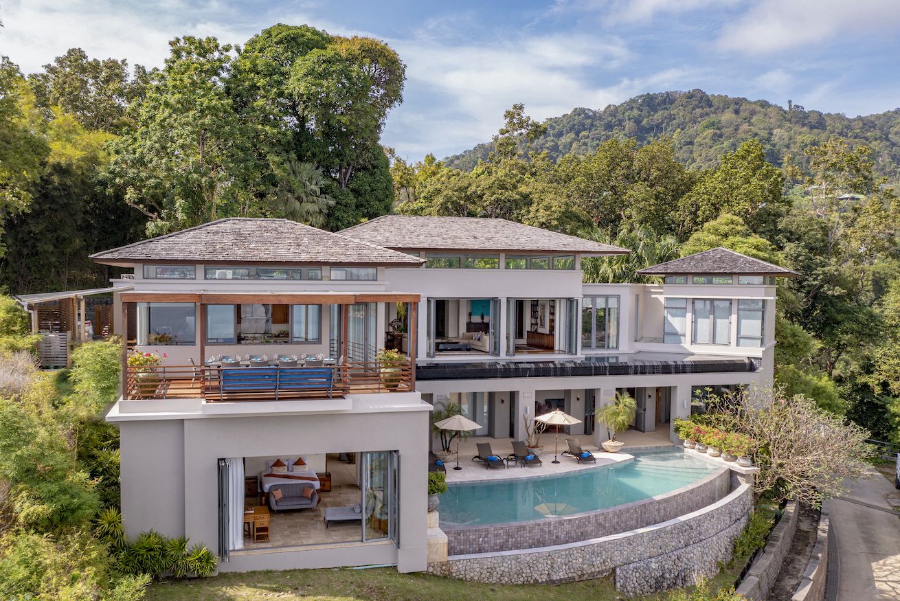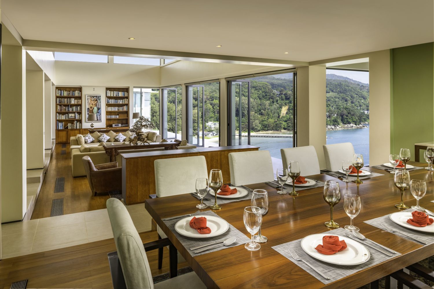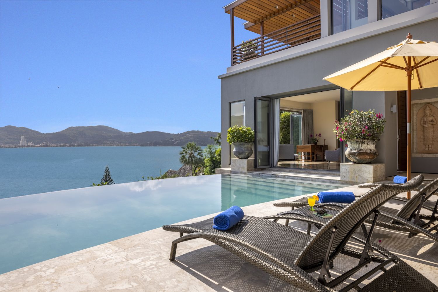 Плюшевый большой диван обеспечивает места в первом ряду, чтобы глаза могли смотреть на отражающий пруд, выложенный ониксовой плиткой, который, казалось бы, тает в заливе Нака Бей и мерцающем Андаманском море за его пределами.