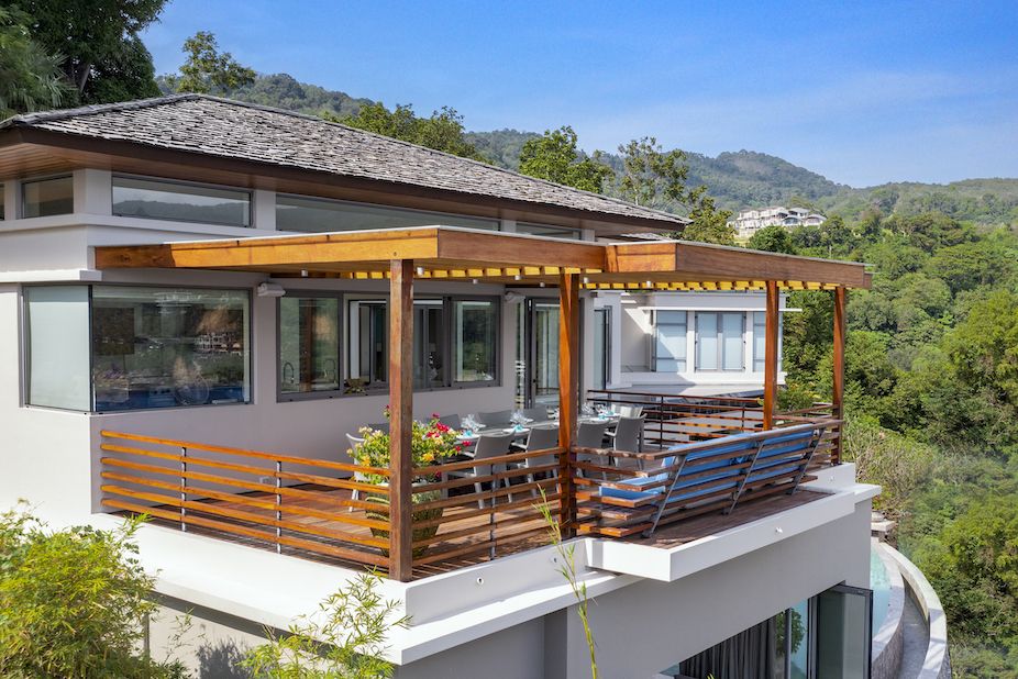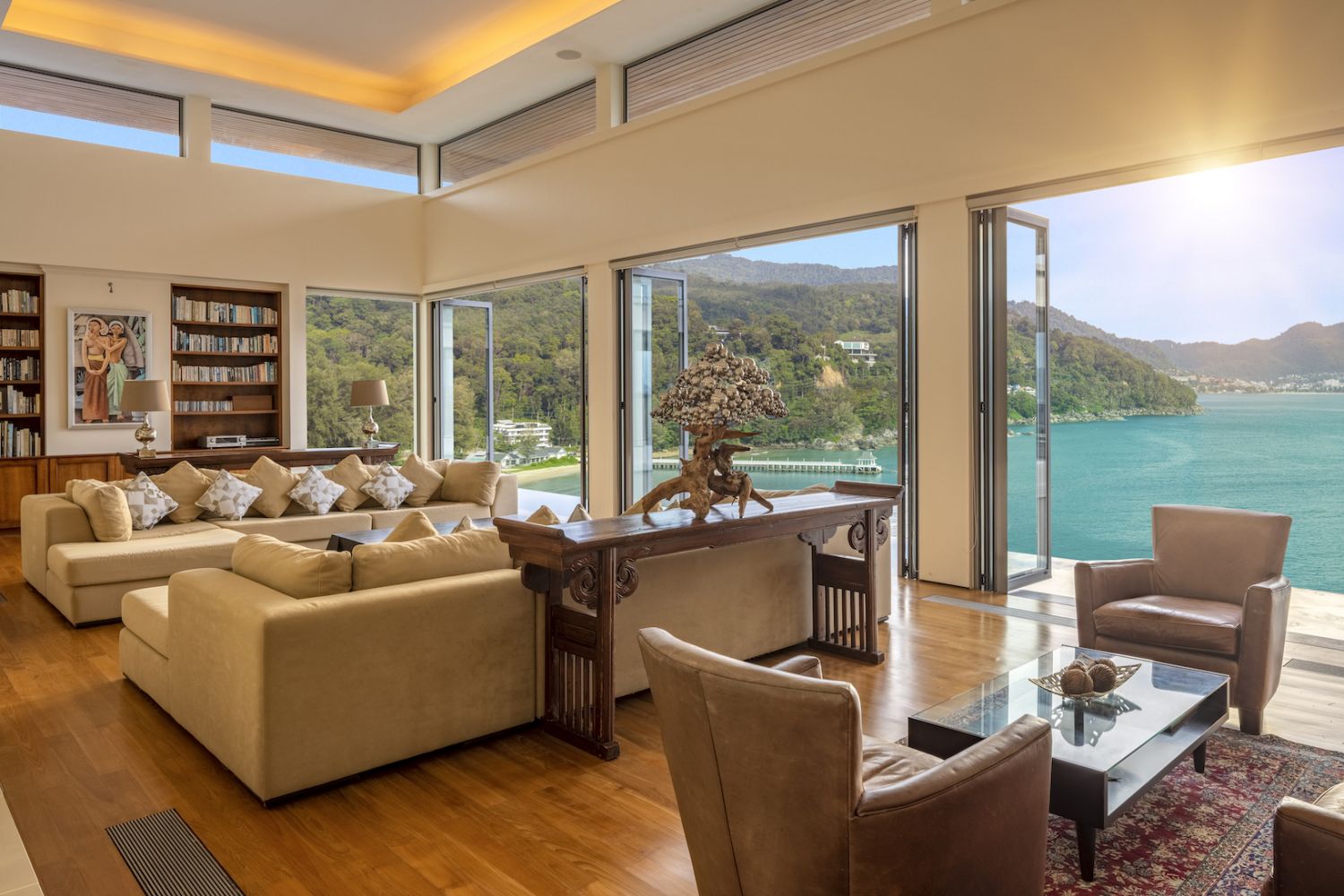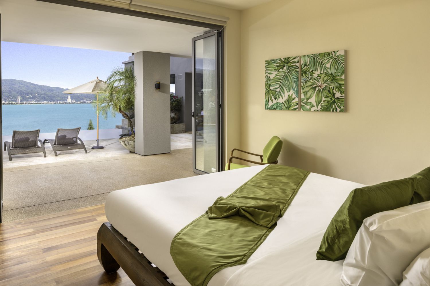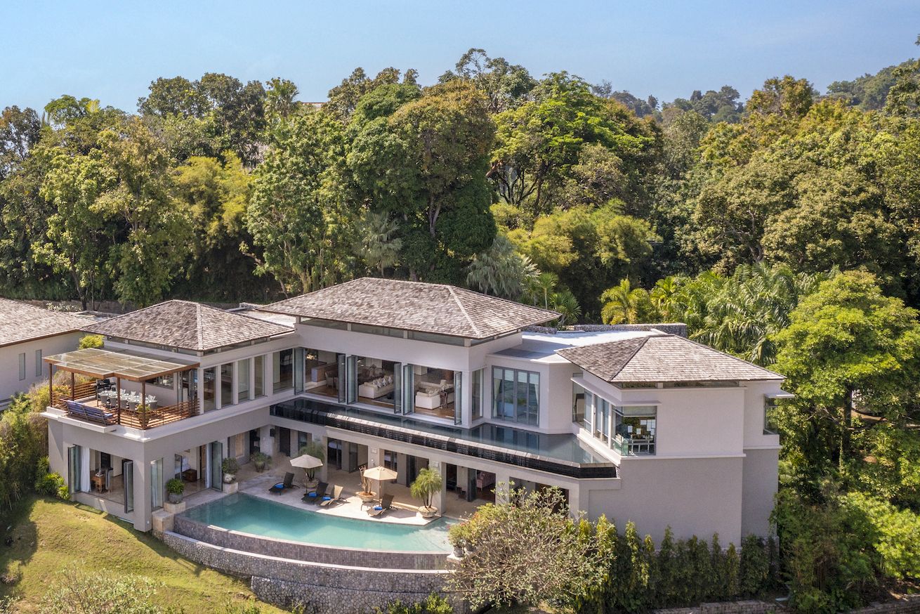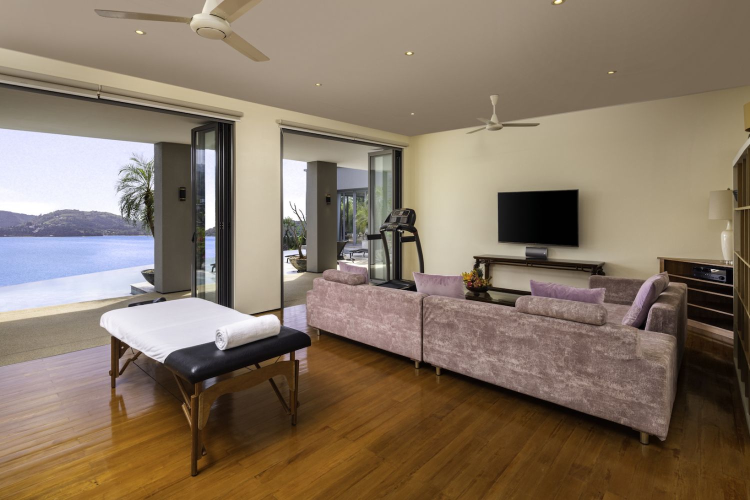 Плюшевый большой диван обеспечивает места в первом ряду, чтобы глаза могли смотреть на отражающий пруд, выложенный ониксовой плиткой, который, казалось бы, тает в заливе Нака Бей и мерцающем Андаманском море за его пределами.