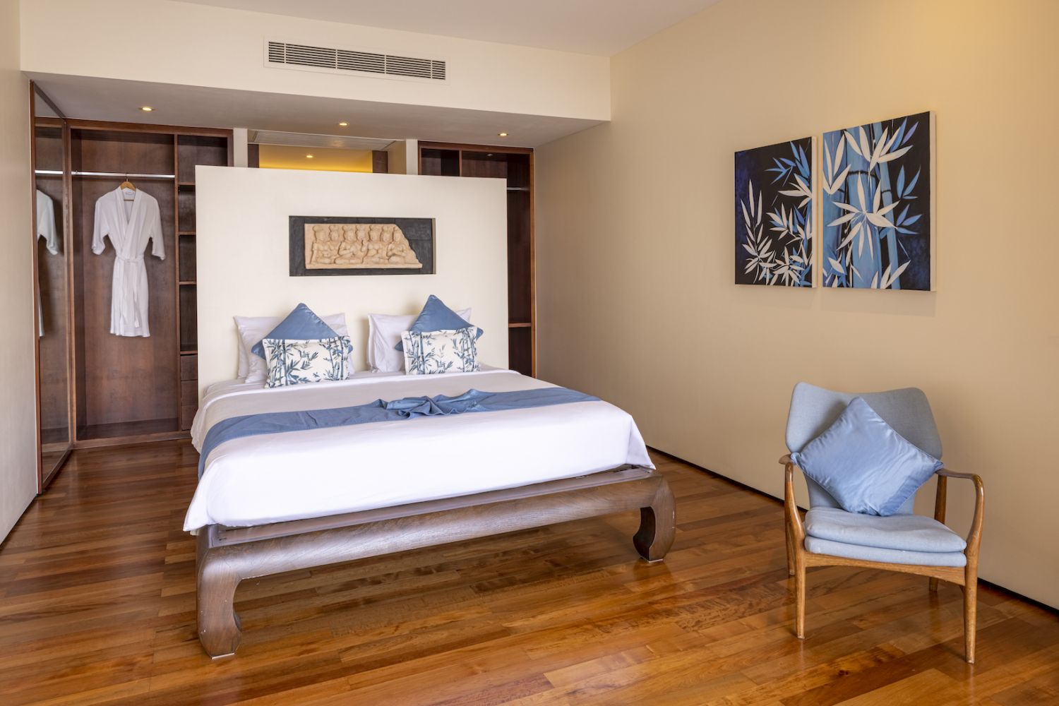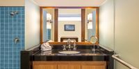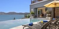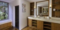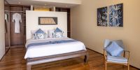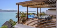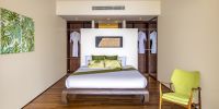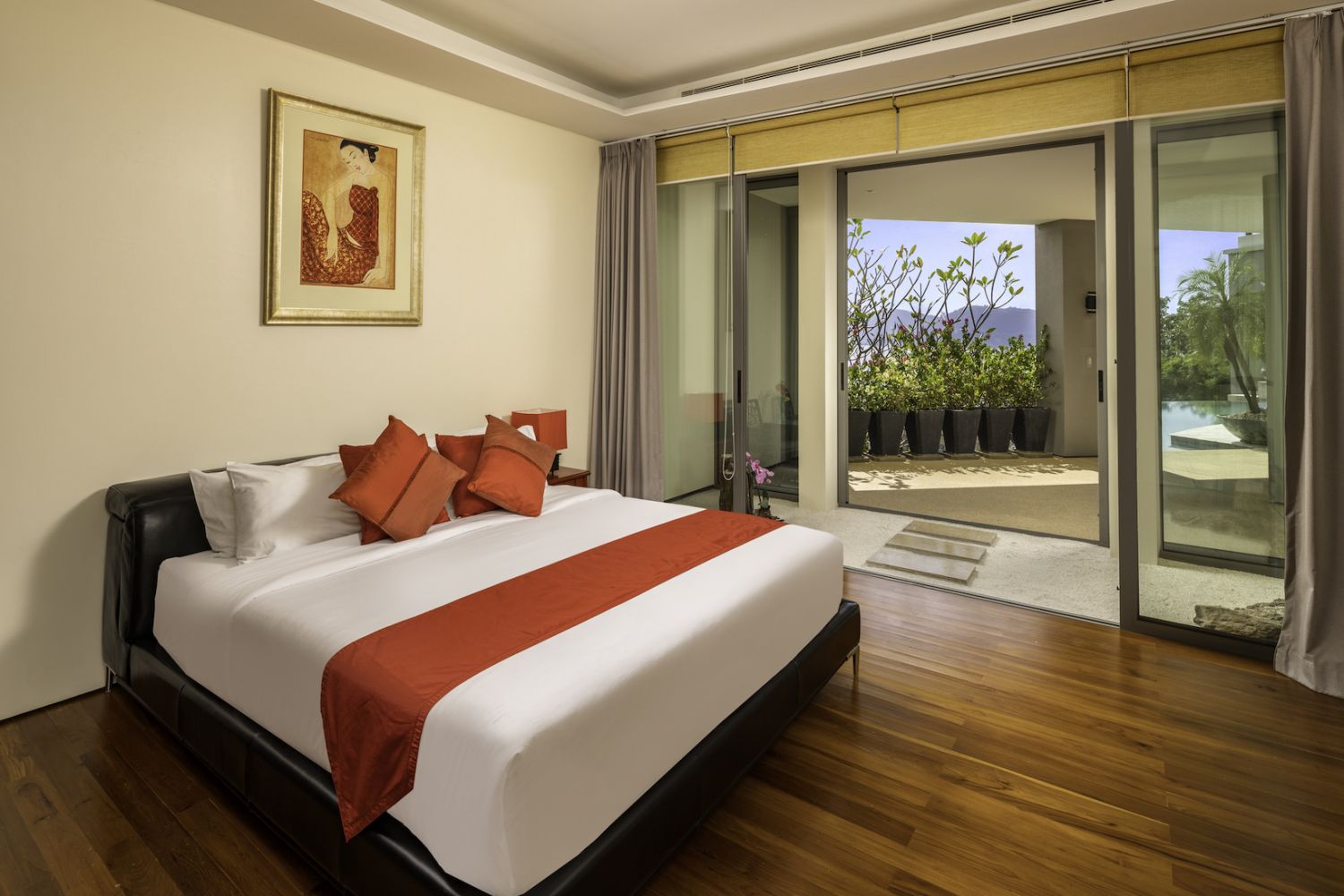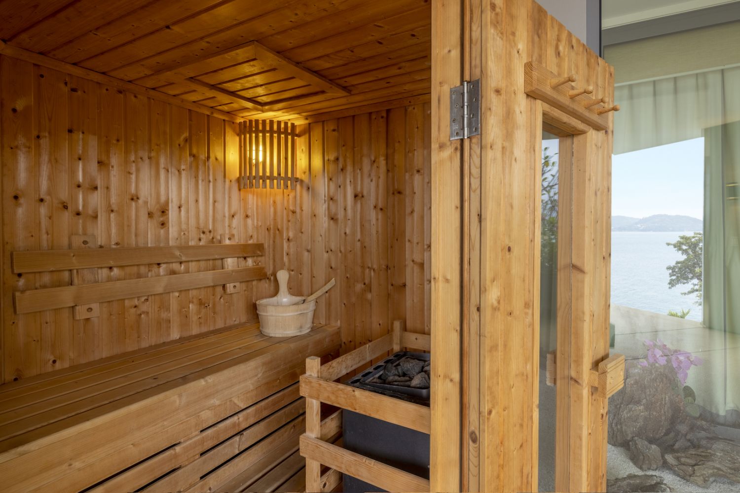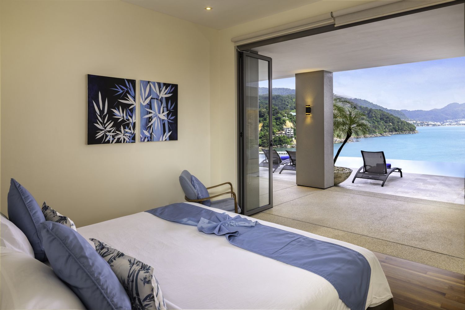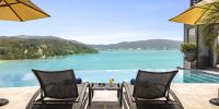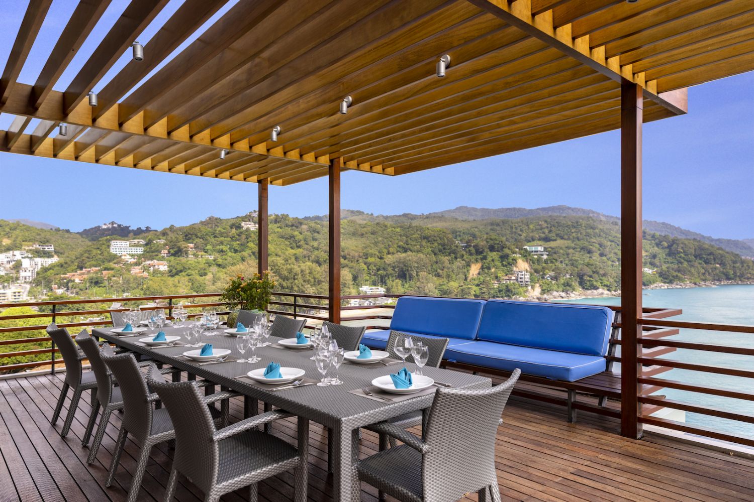 Плюшевый большой диван обеспечивает места в первом ряду, чтобы глаза могли смотреть на отражающий пруд, выложенный ониксовой плиткой, который, казалось бы, тает в заливе Нака Бей и мерцающем Андаманском море за его пределами.