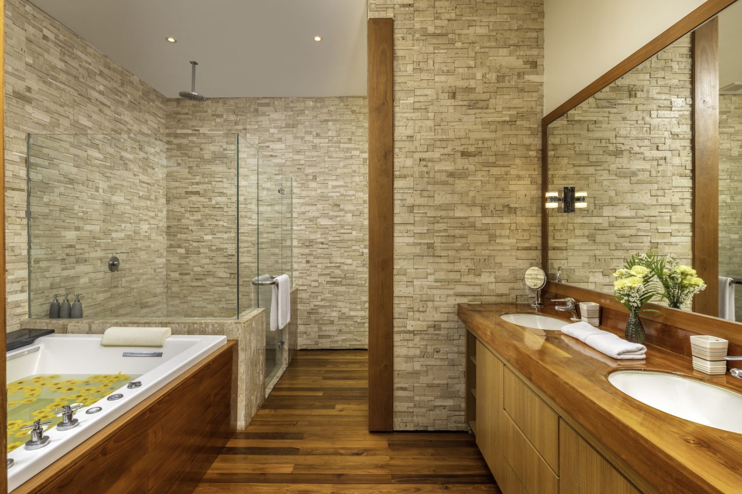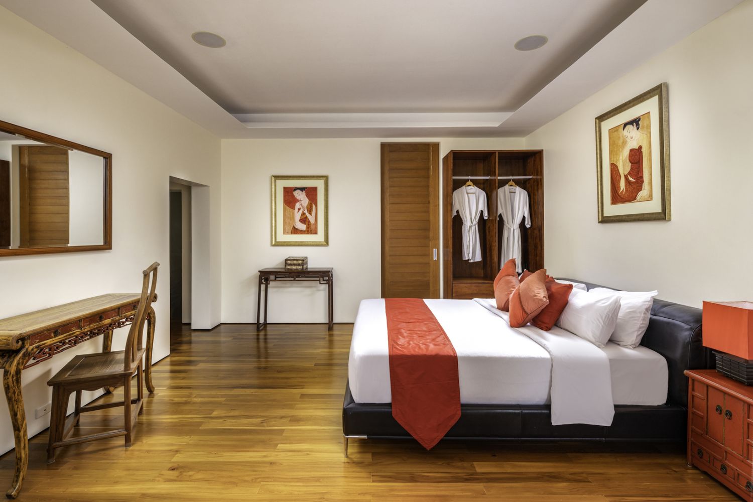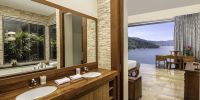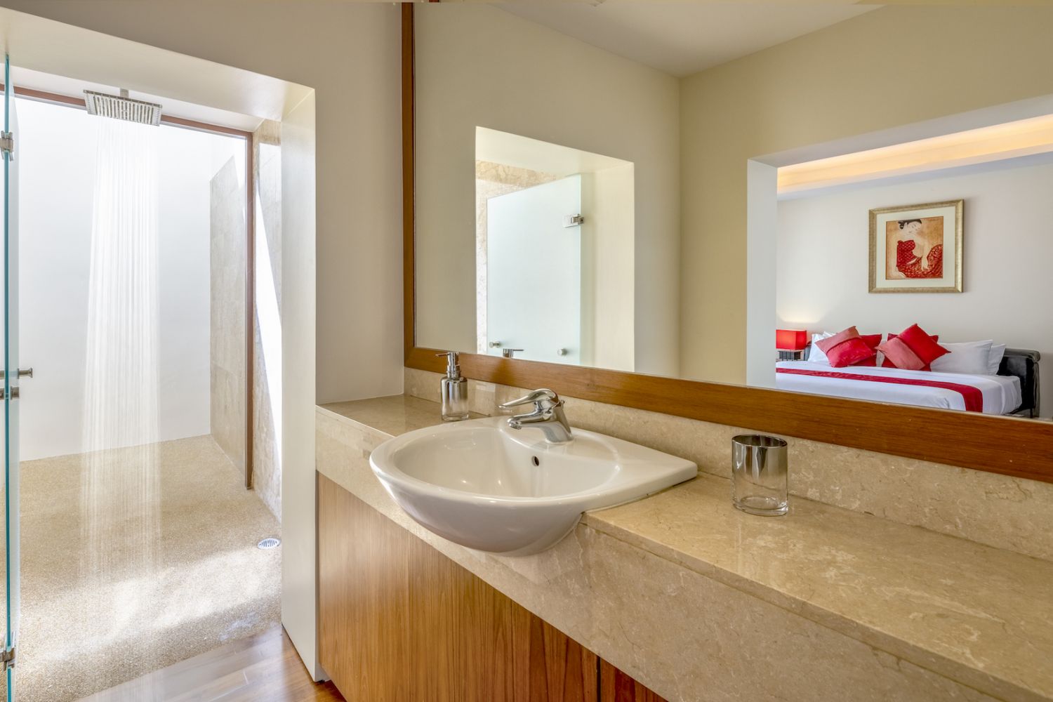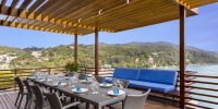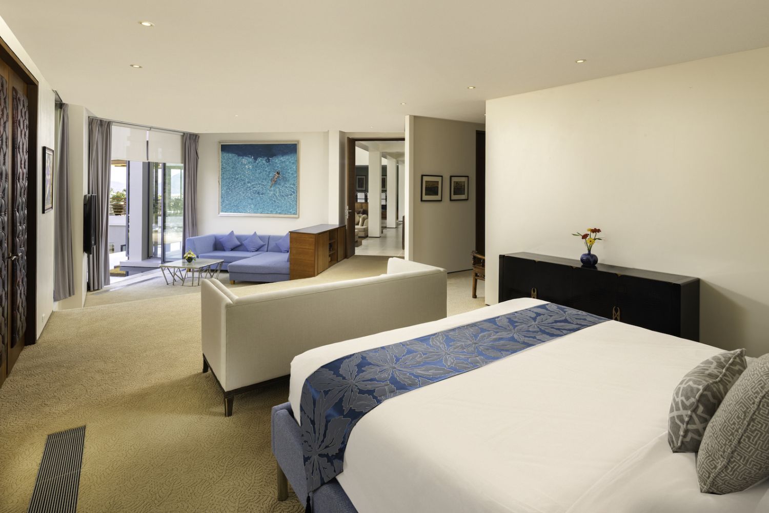 Плюшевый большой диван обеспечивает места в первом ряду, чтобы глаза могли смотреть на отражающий пруд, выложенный ониксовой плиткой, который, казалось бы, тает в заливе Нака Бей и мерцающем Андаманском море за его пределами.