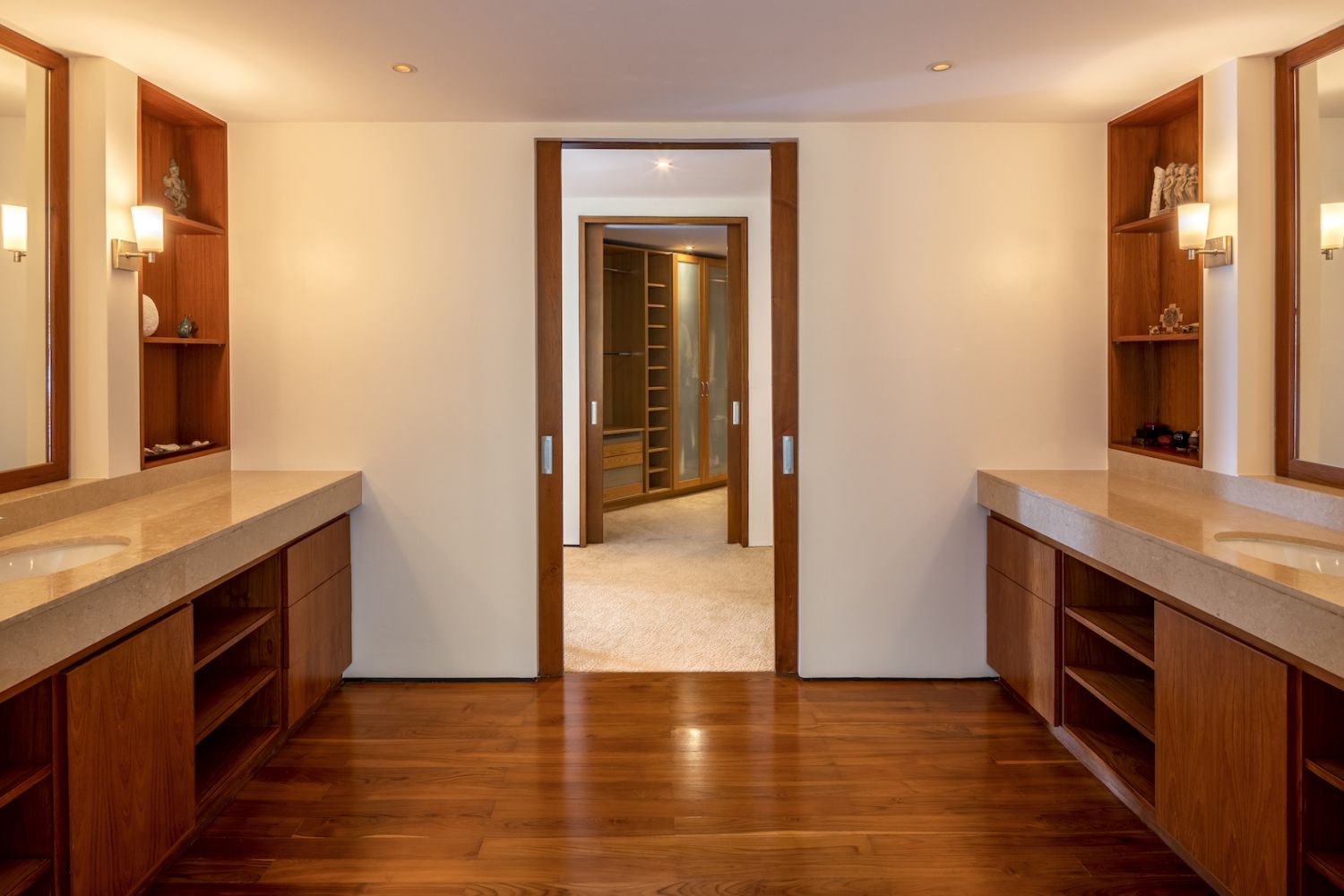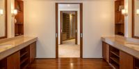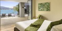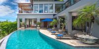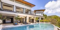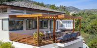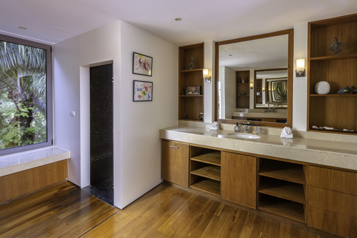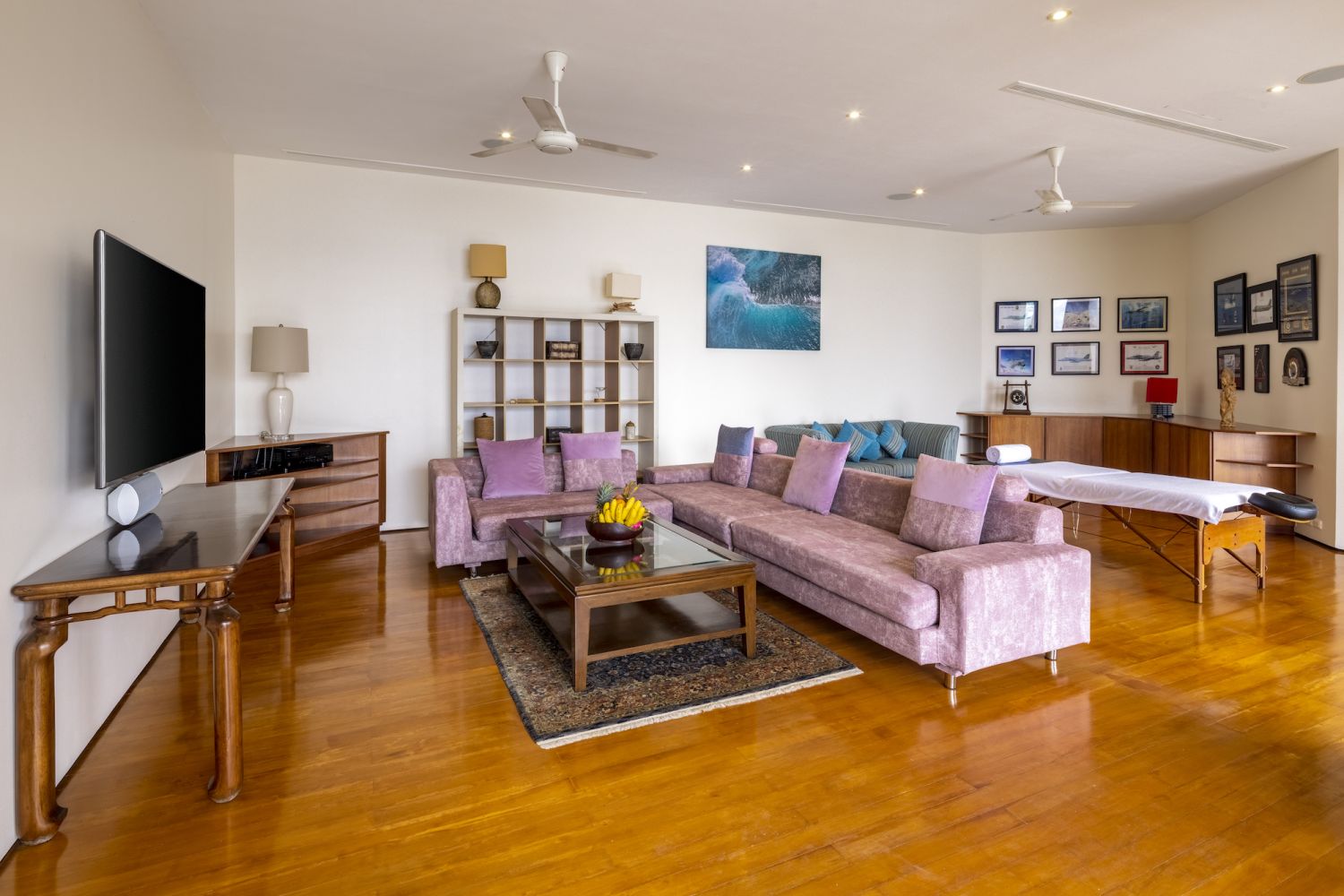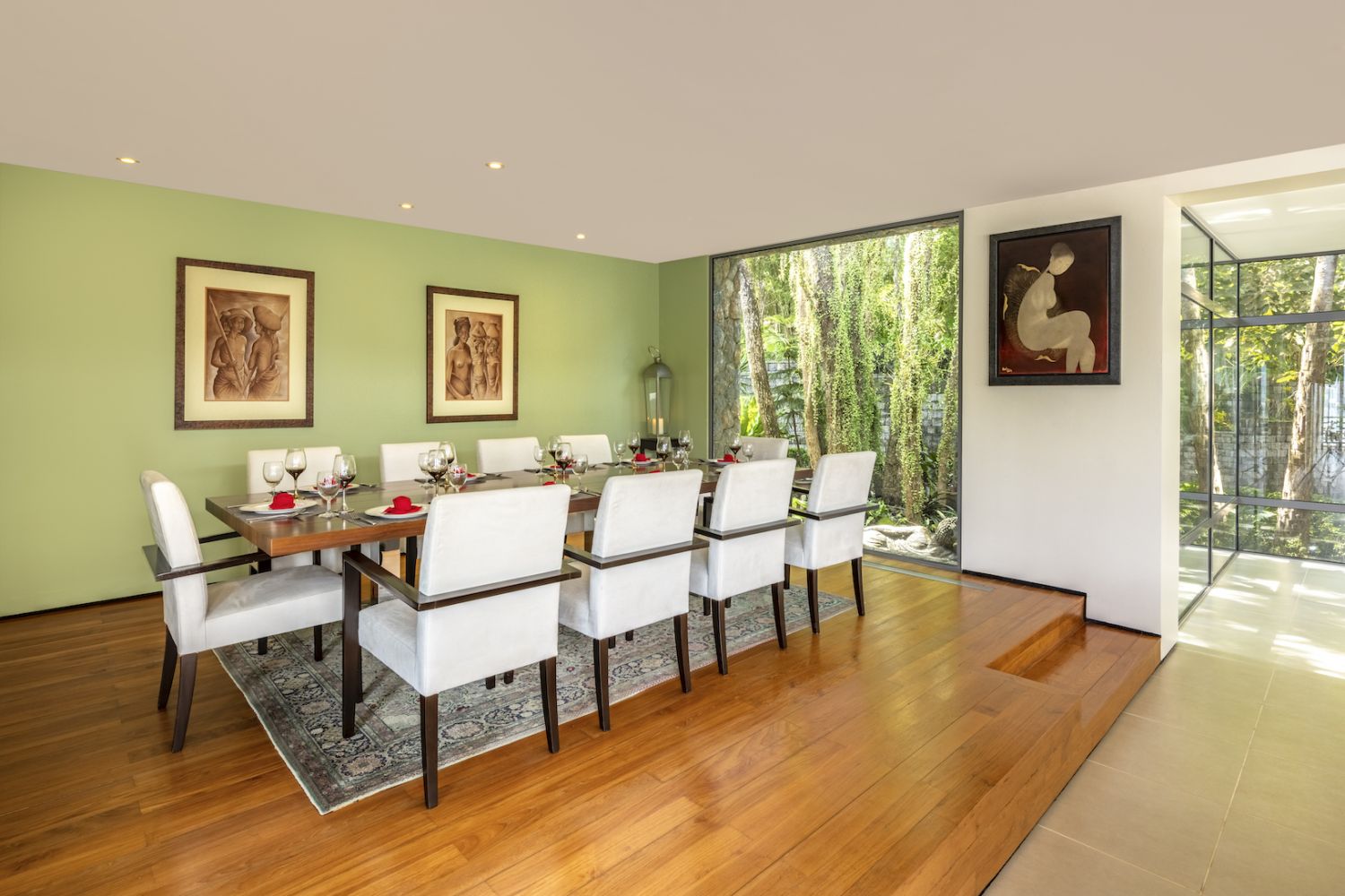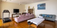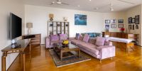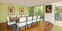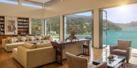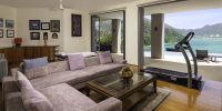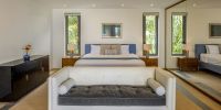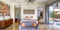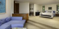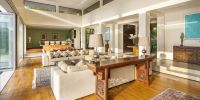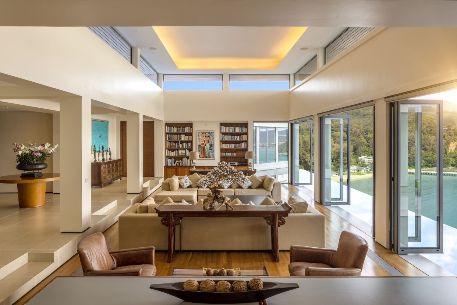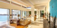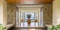 Парадный вход ведет в широкую гостиную, пространство, естественно освещенное солнечными лучами, проникающими через стеклянный фасад, который можно открыть, чтобы вдохнуть ароматный океанский бриз.