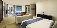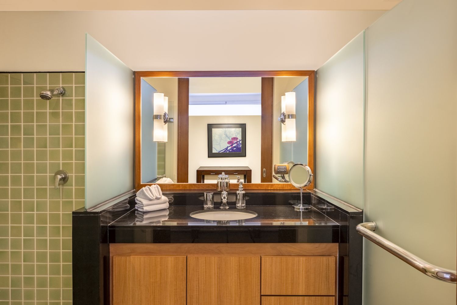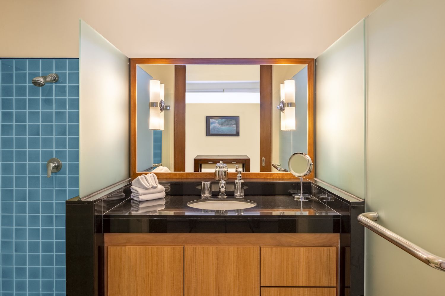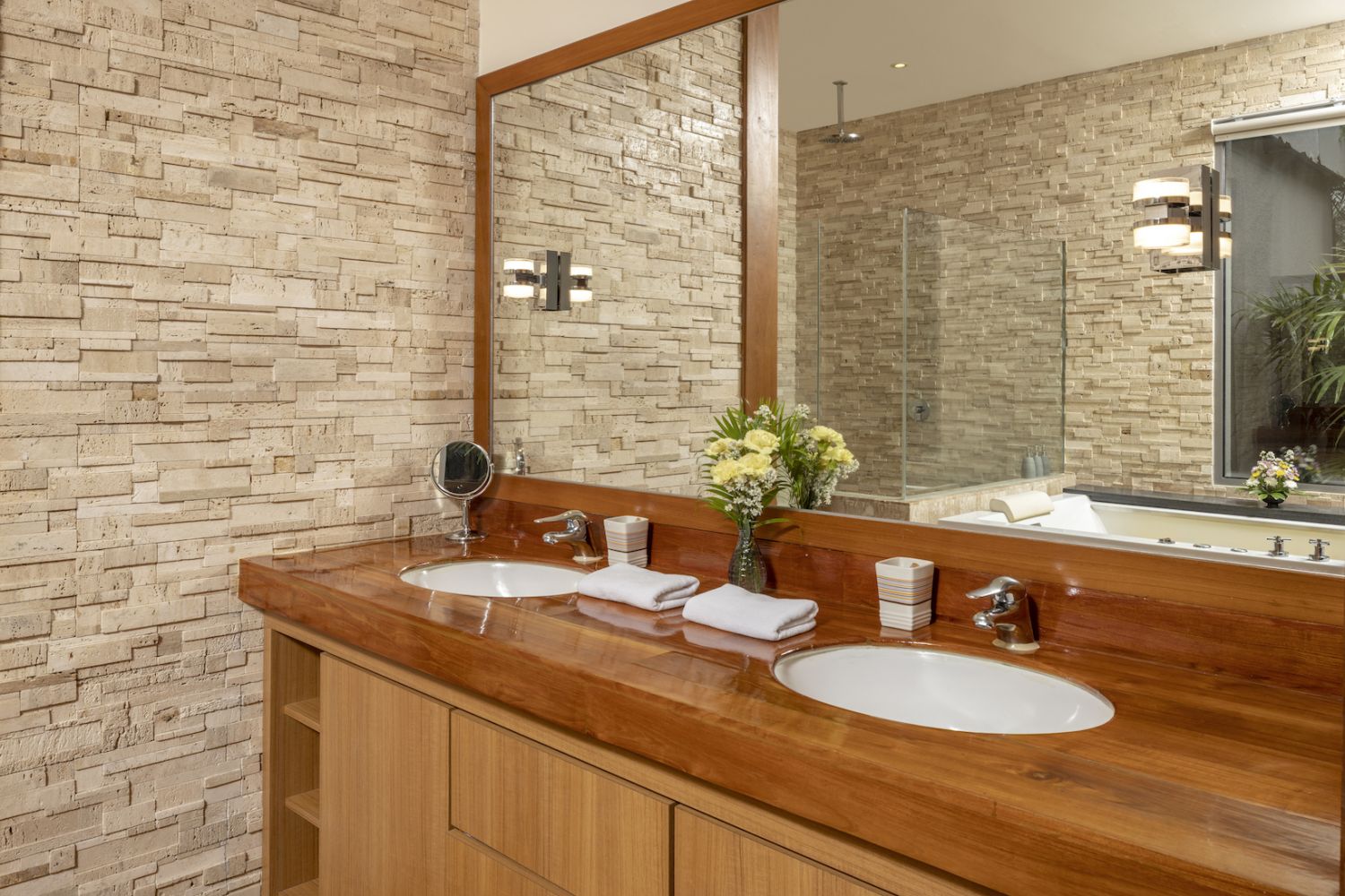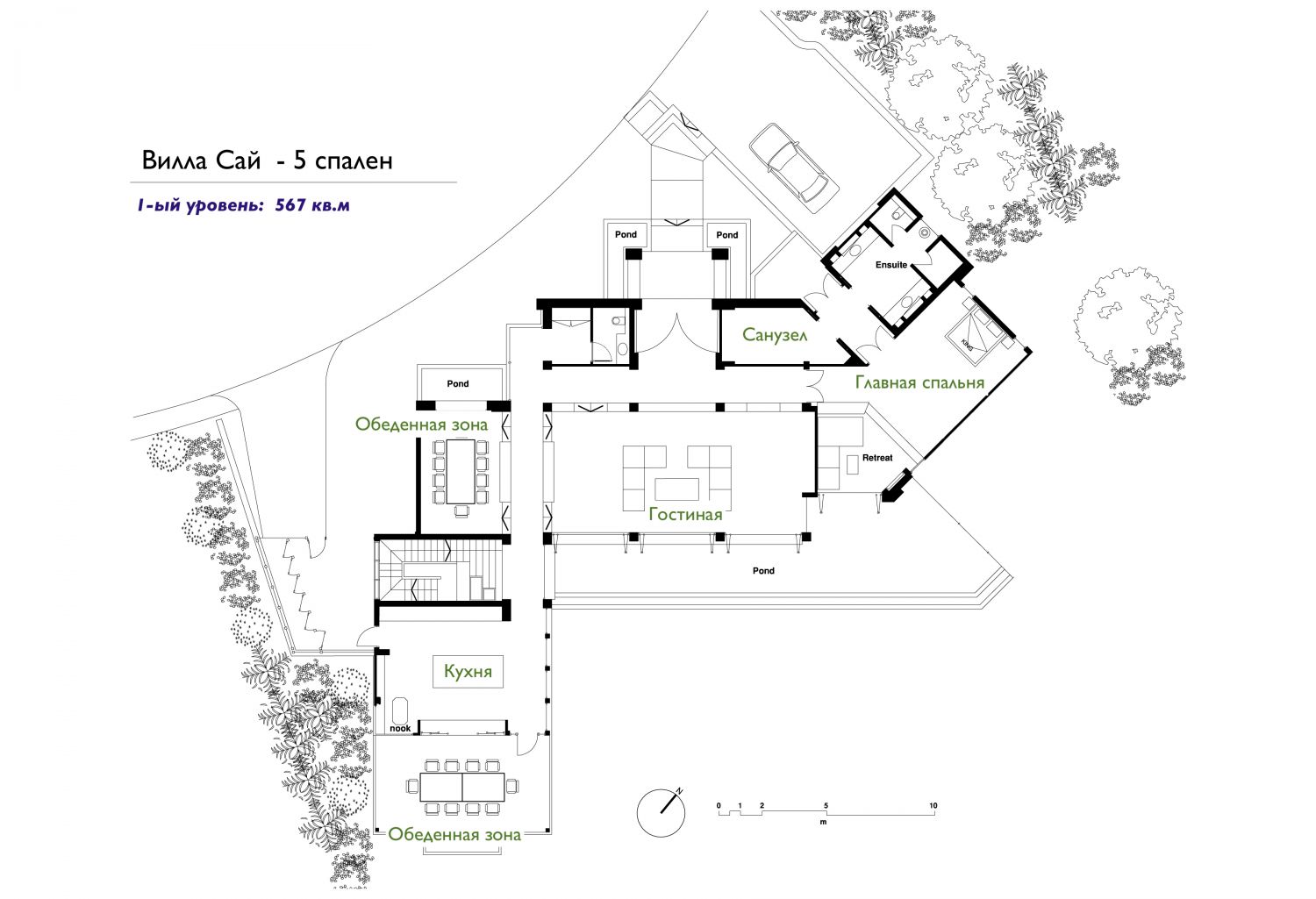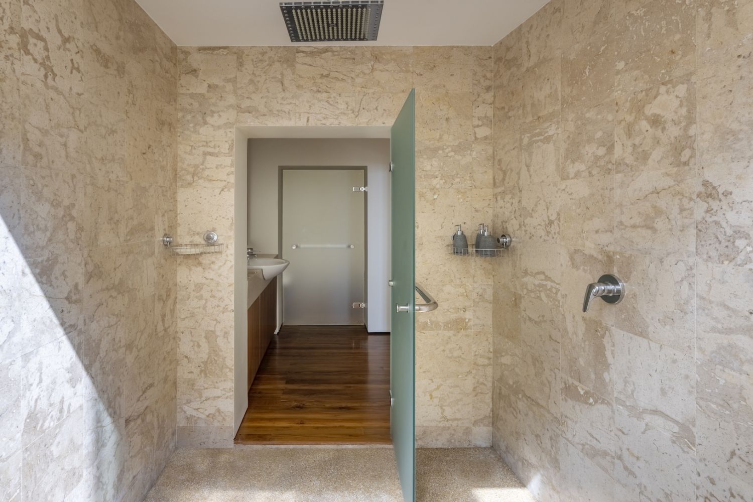 Парадный вход ведет в широкую гостиную, пространство, естественно освещенное солнечными лучами, проникающими через стеклянный фасад, который можно открыть, чтобы вдохнуть ароматный океанский бриз.