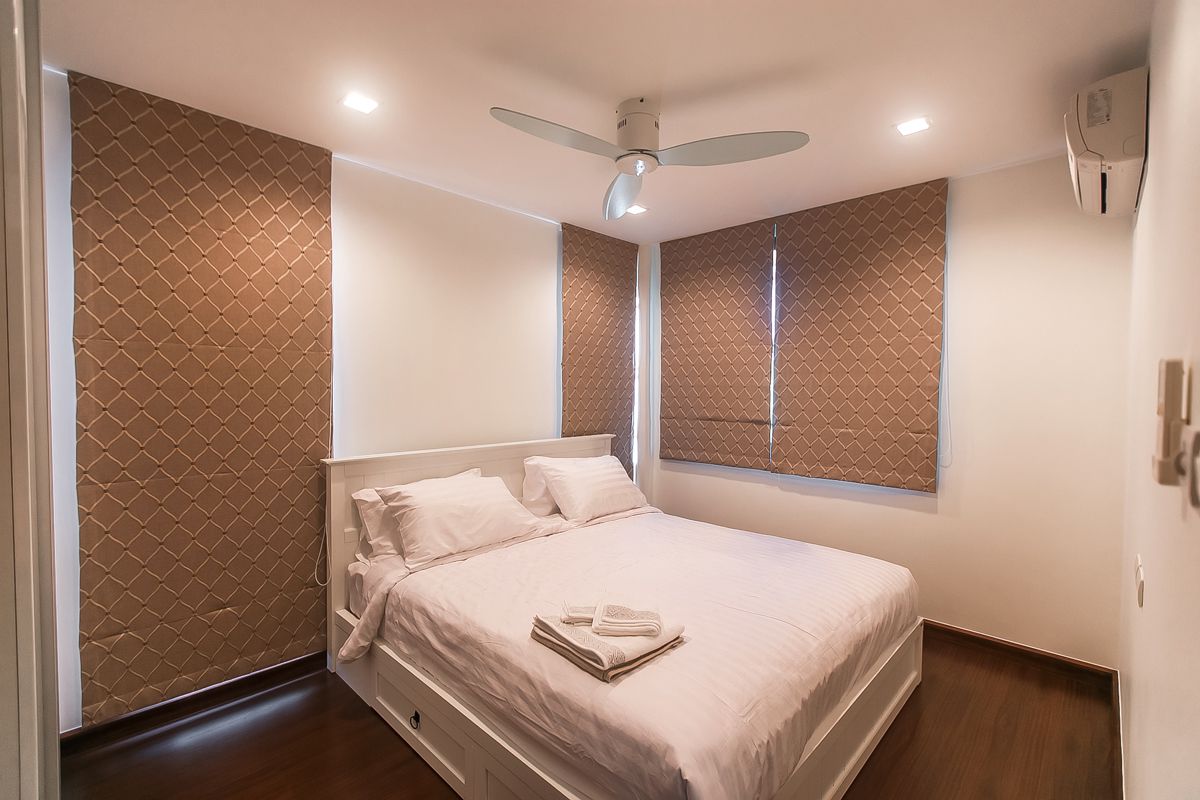 2 спальни. Санузлы с душем, кондиционеры и потолочные вентиляторы, шкафы.