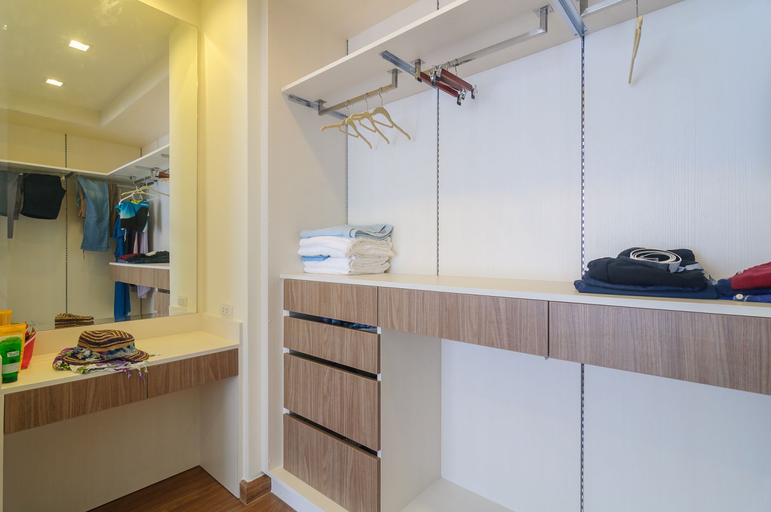 Вместо обычного платяного шкафа тут встроена гардеробная зона. Также есть небольшой туалетный столик с зеркалом. В этой комнате установлен сейф.