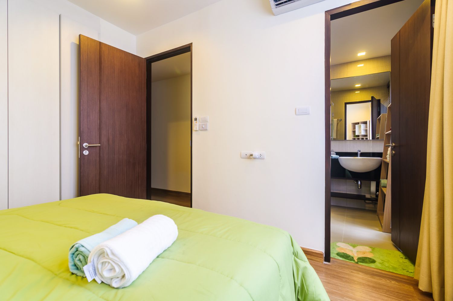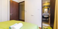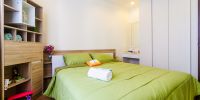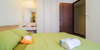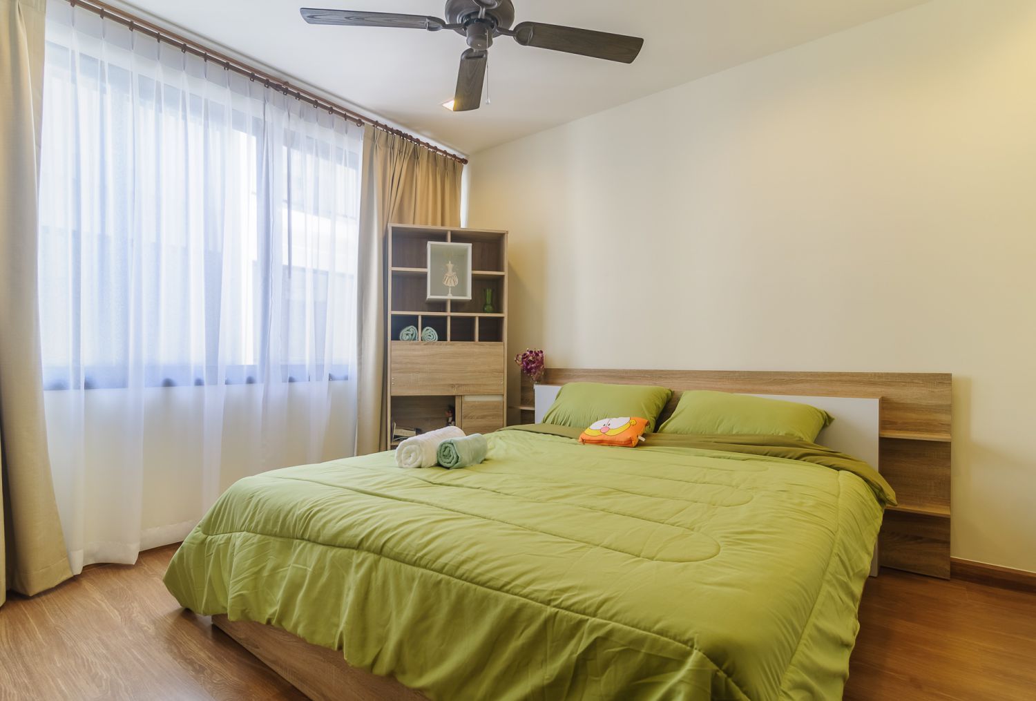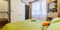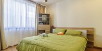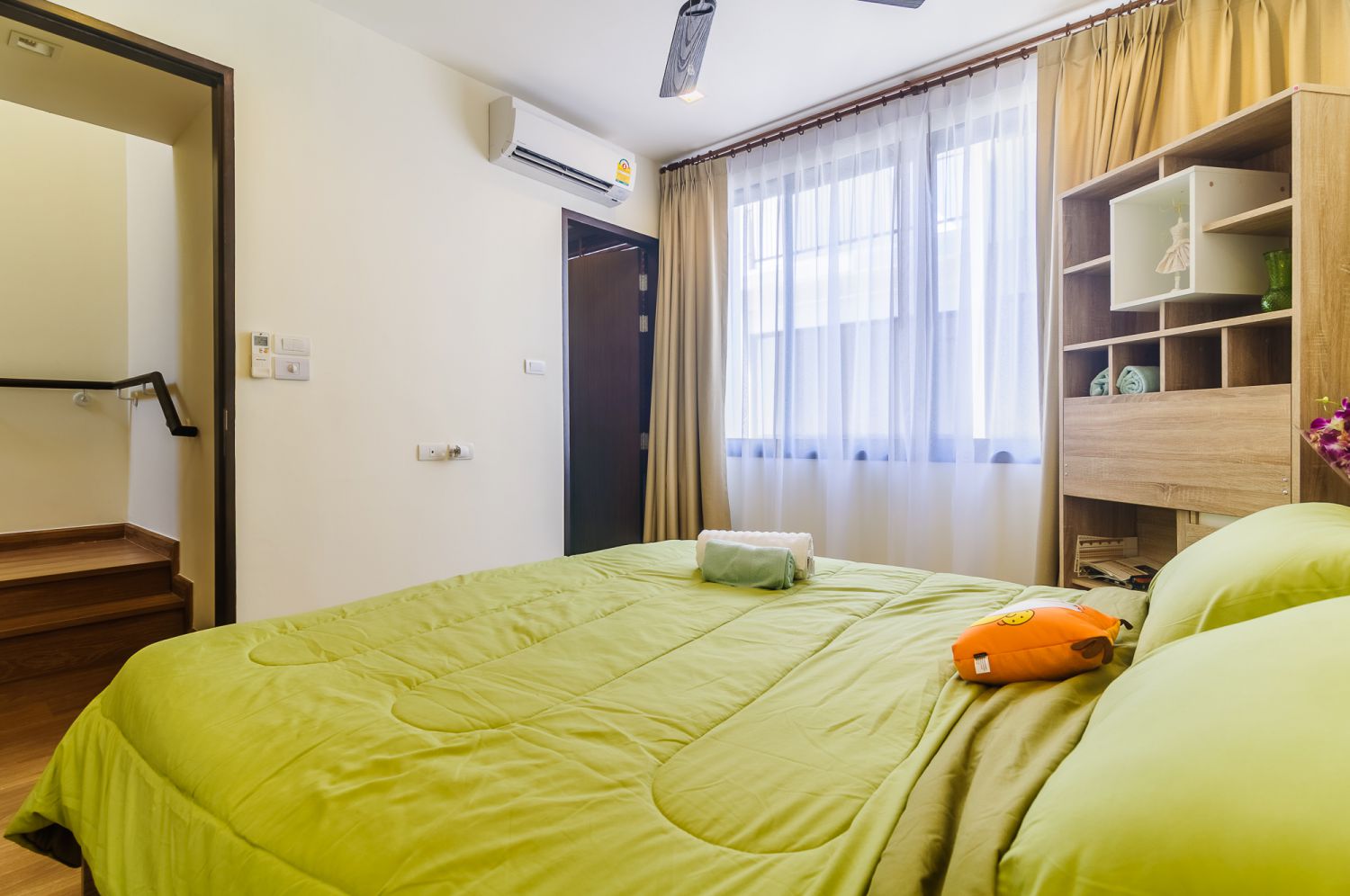 Спальня оформлена в зеленых тонах, что придает ей особую романтичность. В спальне есть как кондиционер, так и потолочный вентилятор. Есть большой шкаф, туалетный столик с зеркалом.